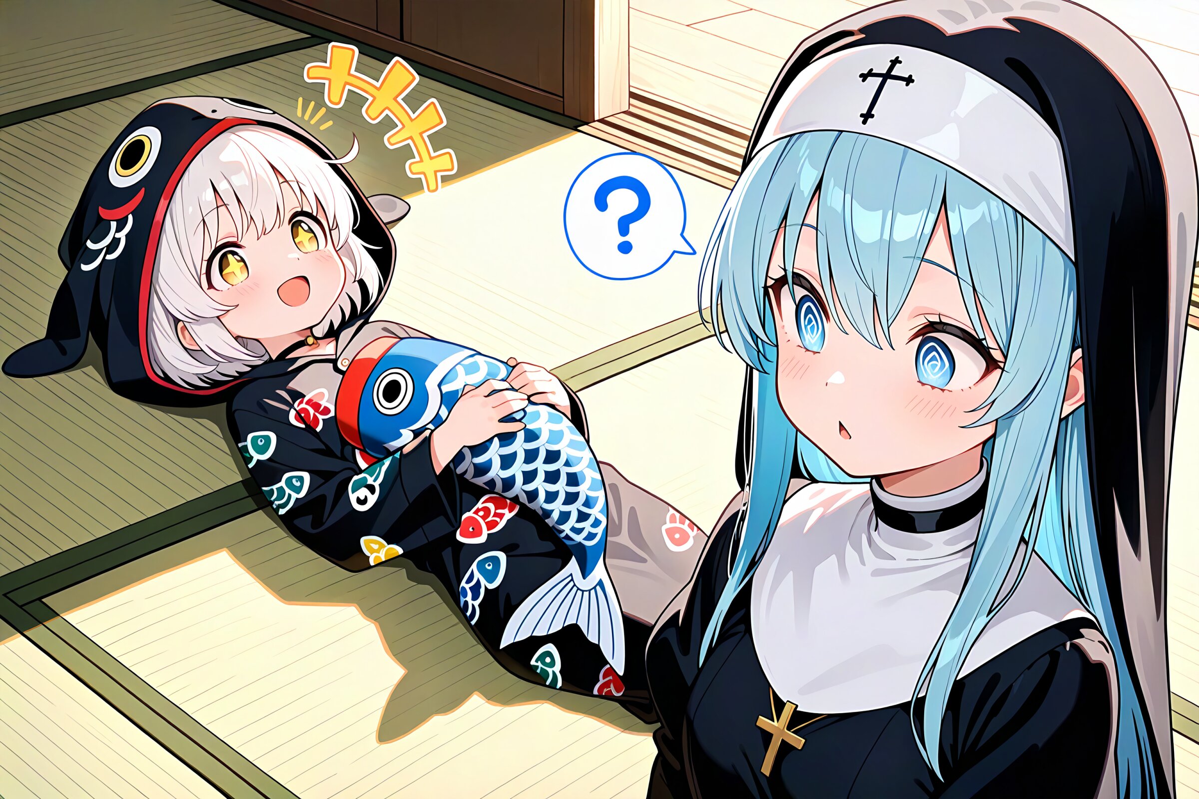 2 little girls, full body, masterpiece, best quality, amazing quality, very aesthetic, white hair, short hair, yellow eyes, + +, open mouth, smile, cheerful, +++, notice lines, choker, koinobori pajamas, hood on, lying, black clothes, tatami, BREAK 2 little girls, upper body, masterpiece, best quality, amazing quality, very aesthetic, sky blue hair, long hair, straight hair, @_@, chestnut mouth, confused, troubled, ?, spoken question mark, choker, nun outfit, tatami,