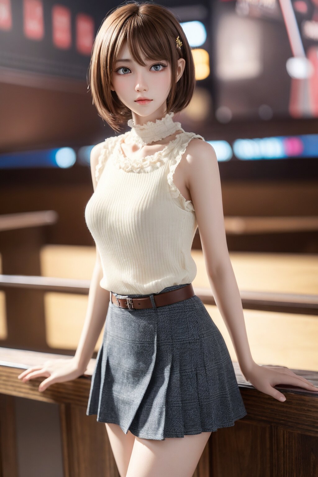 masterpiece, RAW photo, hyper detailed, 16K, extremely detailed CG, Japanese woman, 23yo, ((solo)), cute, pretty, hyper detailed eye, hyper detailed face, medium hair, bangs, extremely detailed, thin, tall, perfect anatomy, good proportion, extremely detailed body, perfect proportion, blouse,short skirt, extremely detailed blouse and skirt, hyper detailed background,