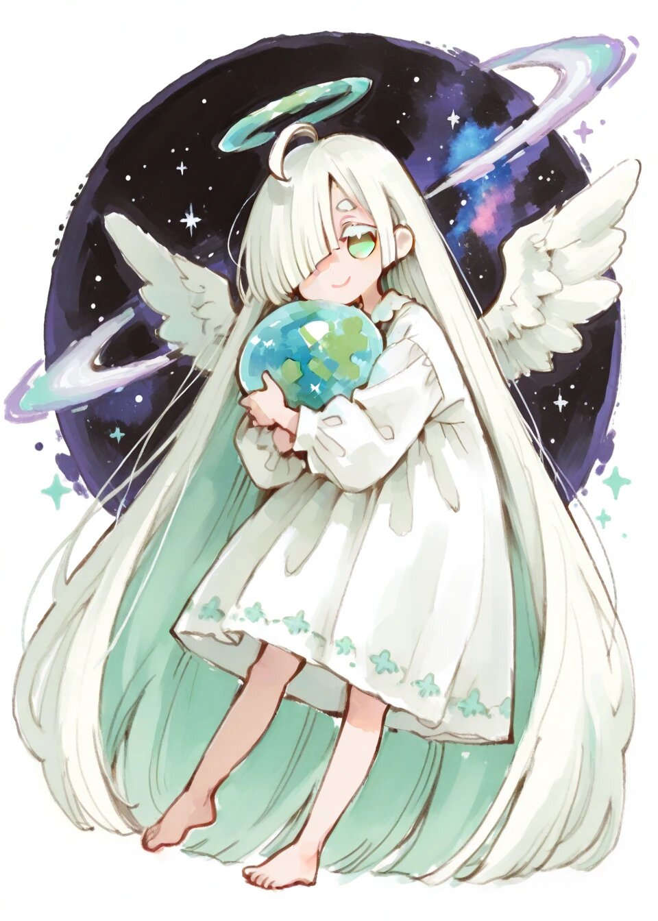 chibi, solo, 1girl, hugging earth, space, halo, white wings, (bright white hair), absurdly long hair, floating hair, blunt bangs, white thick eyebrow, white colored eyelashes, (hair over one eye), ahoge, mint green eyes, white dress, longsleeves, barefoot, smile, ultra-detailed, best quality, masterpiece, very aesthetic, watercolor painting, general