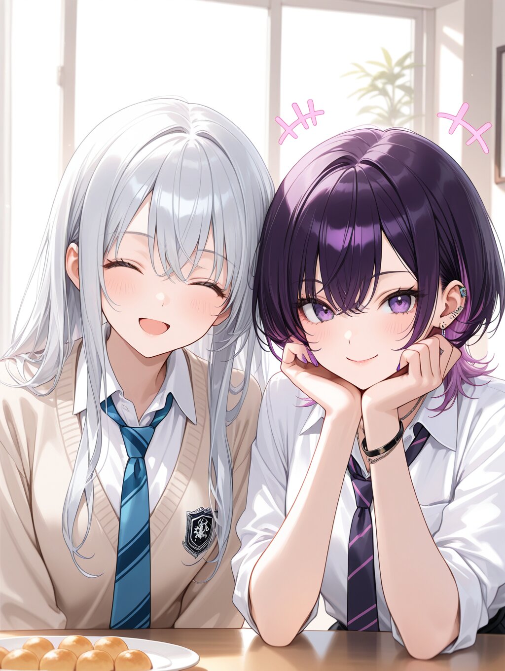masterpiece,ultra detailed,detailed shading,detailed texture,(catchlight:1.3),highly detailed eyes,watery eyes,<lora:cveb6c5e878c739bt83g:0.4>,cafeteria, table,sweets,looking_at_viewer,full head,(smile:1.1),(2girls:1.1),eye_contact,chatting,pose, ADDBASE, 2girls,(blue silver long hair:1.1),:d,school_uniform,blue tie,beige knit,checkered,closed eyes,laughter eyes, ADDCOL, 2girls,purple hair,wolf cut,purple eyes,(gyaru:1.2),earrings,ear cuff,black bracelet,+++,purple nails, (smile:1.2),