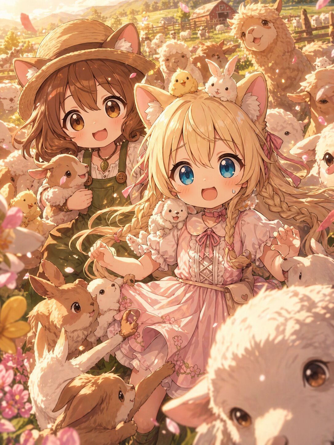 Use the uploaded image as the absolute reference for the character design, including face, eyes, hair, proportions, and overall style. Maintain exact visual consistency. two girls, sisters, similar height, same age appearance, cat ears, natural cat tails, spring farm, golden hour, soft sunlight, gentle breeze, vast green meadow, wooden fence, distant barn, rolling hills, flowers, floating petals, warm atmosphere, extremely crowded composition, animals everywhere, sheep, goats, alpacas, rabbits, chicks, animals overlapping characters, layered depth, filling the entire frame, fluffy textures, dense visual information, playful chaotic scene, animals nuzzling, climbing, interacting actively, younger girl centered, main focus, long blonde hair, braid, hair between eyes, blue eyes, wearing pastel pink dress, soft thin fabric, knee-length, flared skirt, puff sleeves, rounded collar, ribbon, bright surprised smile, slightly overwhelmed, hands raised slightly, small animals on head and shoulders, animals pulling her dress, surrounded tightly, older girl very close behind her, slightly to the side, chestnut brown hair, wavy bob, inward curls, bangs, brown eyes, wearing olive green overalls, white blouse, straw hat, big smile, relaxed posture, gently holding or interacting with small animals, extreme close-up, low angle, wide angle lens, slight lens distortion, foreground animals very large and partially cropped, framing edges, one animal looking at viewer, eye contact, dynamic motion, wind in hair and clothes, petals flying, backlighting, rim light, glowing particles, cinematic lighting, depth of field, foreground blur, high detail, soft and vibrant colors, warm tones, anime style, masterpiece, best quality, --ar 3:4