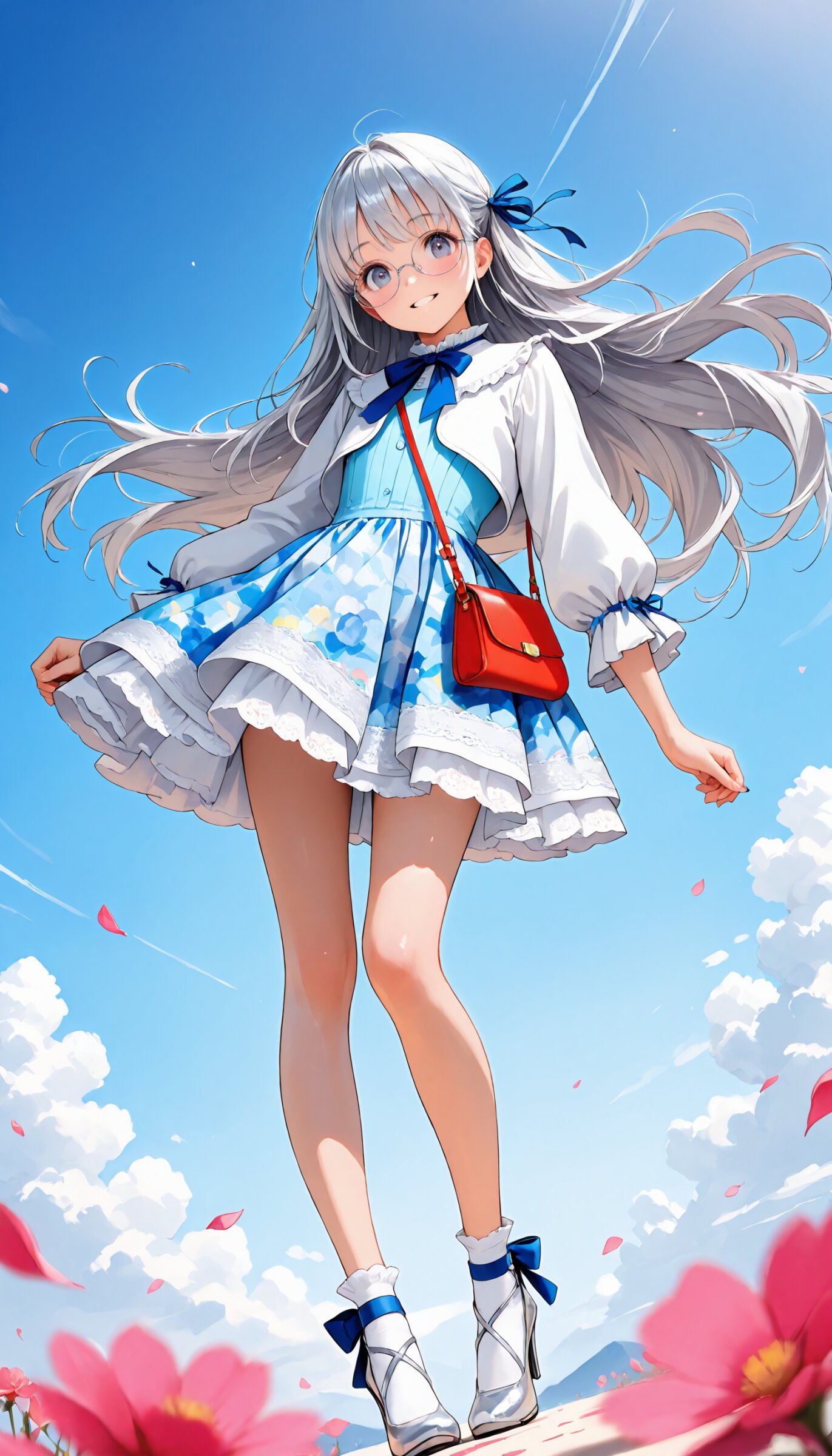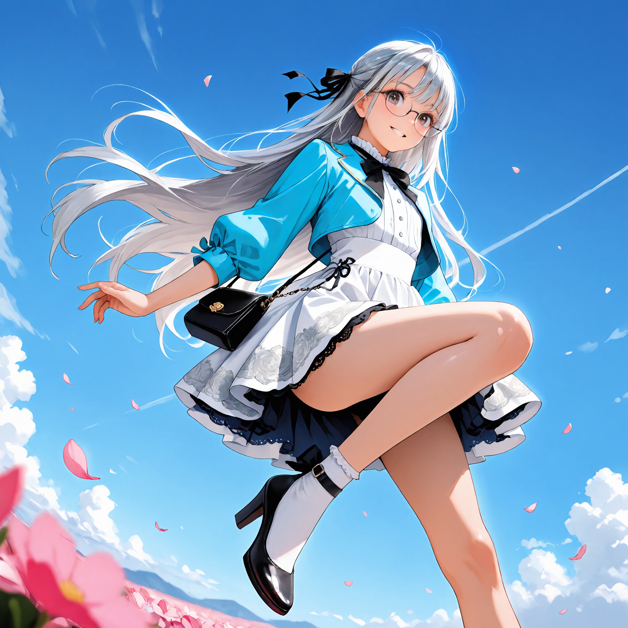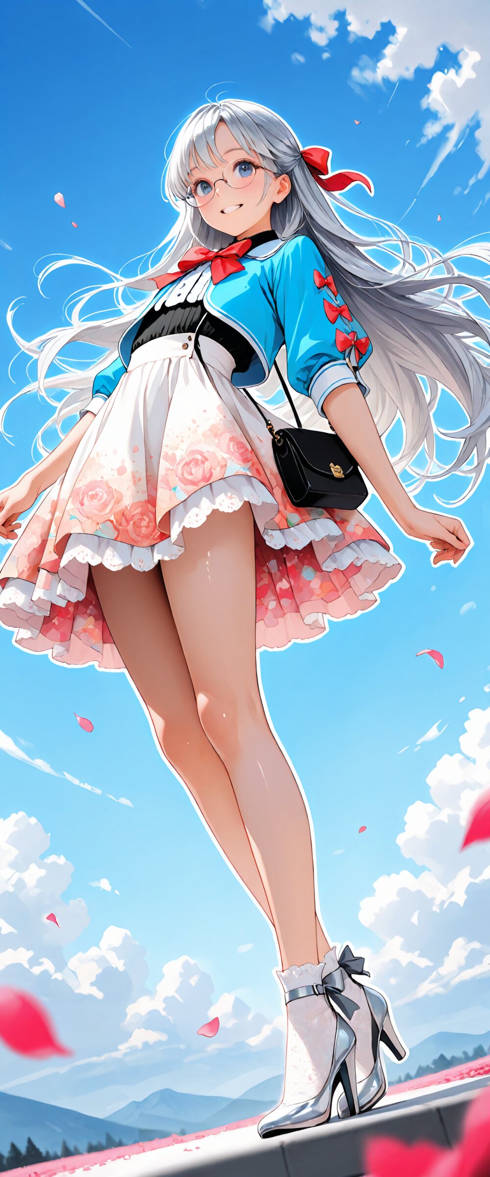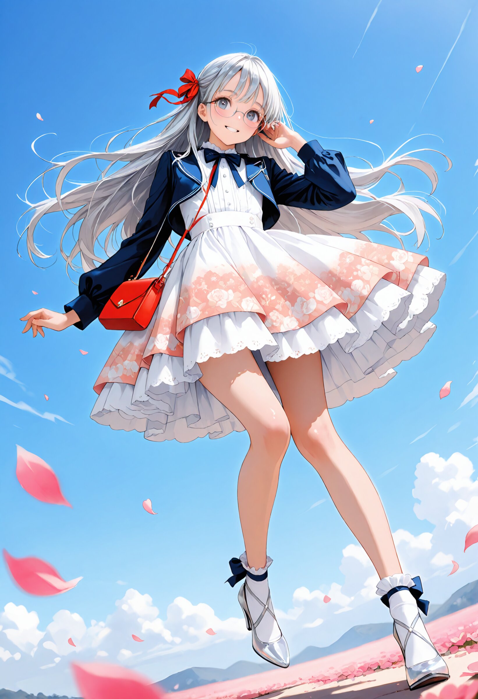 (rating: sensitive:1.2), score_9, score_8_up, score_7_up, score_6_up, delicate illustration, highly decorative, (watercolor style illustration). (perspective, super dynamic angle from front), diagonal view. 1girl with glasses:1.3, tareme, hair ribbon, cropped jacket with piping trim, bow tie frilled blouse, asymmetric tiered skirt, layers of lace ruffles on skirt, socks, ankle strap heels, slim legs, small handbag, blue sky, (straight silver hair, very long hair:1.3), floating hair, (fashion illustration, early summer colors, ultra-intricate detailed), (white outline), bold colors, patterned fabric, beautiful composition, in the style of cute anime girl. BREAK insanely beautiful and detailed clothes, intricately shiny hair, beautiful small face, big round eyes, long eyelashes, double eyelids, parted lips, smile, kawaii, cute, flat chest, slender, {exquisitely delicate skin}, perfect anatomy, (dynamic angle, dynamic pose), BREAK perfect AI rendering, three-quarter view. ((DOF), blurry foreground), sharp focus on the girl, increasing depth, (petals falling gently), realistic background. BREAK (masterpiece, aesthetic quality, 8K, ultra-detailed), whimsical color palette, (perfect design, realistic complex), absurdres, highres, hyperrealistic, photorealistic, natural lighting,