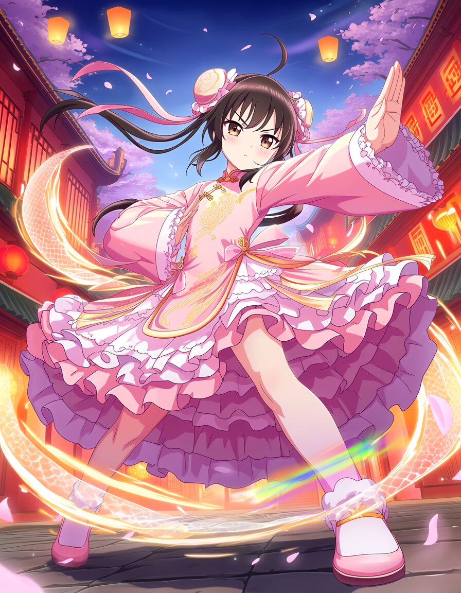 masterpiece, best quality, ultra-detailed, sharp focus, absurdres, 1girl, solo, cute loli, delicate features, large expressive eyes, slight blush, innocent yet fierce expression, flat chest, petite body, almost flat chest, hairstyle: double bun hairstyle, two odango buns with long flowing hair strands and ribbons, outfit: (sweet lolita dominant qipao fusion 7:3:1.4), pastel pink sweet lolita dress with subtle chinese qipao elements, soft pastel pink main color, voluminous multi-layered ruffled skirt with petticoat, abundant lace frills and trims, large ribbons and bows, high mandarin collar, frog buttons, intricate golden dragon embroidery on chest and sides, high side slits, dynamic chinese kung fu pose: powerful bow stance (gong bu), one leg forward with strong body twist, forward powerful palm strike, the other hand guarding, intense fighting spirit, voluminous skirt and hair fluttering dramatically, low angle shot, dynamic low angle view from below for epic power, background: beautiful ancient-modern chinese fusion street, traditional chinese architecture with modern neon signs, stone pavement, red lanterns, cherry blossom petals floating, night cityscape with soft lights, atmospheric depth, lighting effects: prismatic light effect, rainbow light refraction, spectral light dispersion, iridescent color streaks, light splitting into vivid spectrum, translucent glow, soft bloom, fantasy atmosphere, cinematic lighting, subtle light leak effect, warm cinematic light leaks, dreamy glow, gentle overexposure, pastel tones, strong cinematic lens flare, anamorphic light streaks, bright light source from side or above, high contrast, epic atmosphere, motion blur on limbs and flying ruffles, fabric dynamics, wind effect