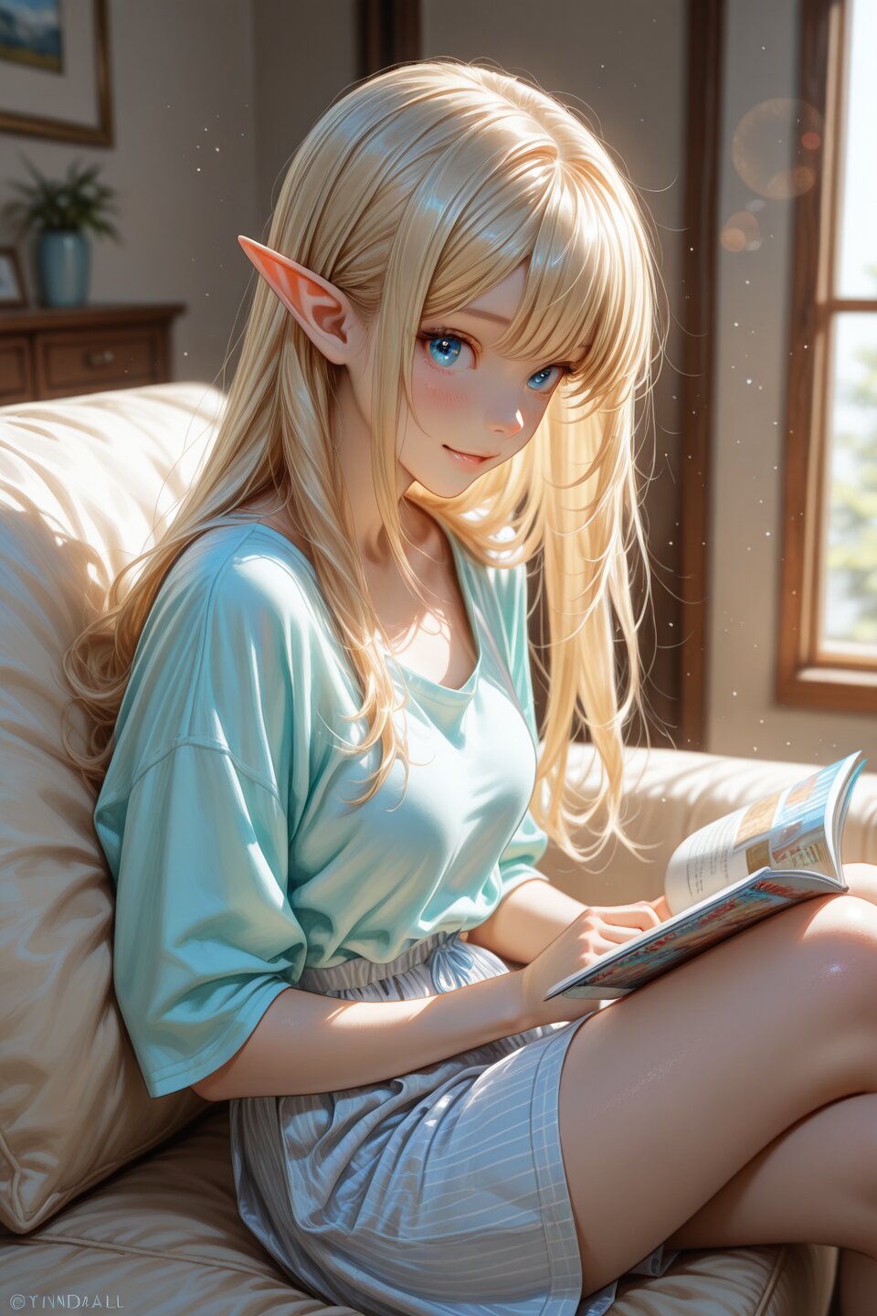 Japanese anime illustration, vertical composition, 9:16 aspect ratio, high detail, clean line art, soft cel shading, vibrant anime colors. A blonde elf girl with long straight hair and blue eyes. Scene: She is resting comfortably in a calm environment, sitting or lying down. holding a opening fashion magazine, from side, high angle, early afternoon, indoors, casual atmosphere, living room, No text, no logo, no watermark., anime style, anime color,, <lora:elf-san_alpha1(AnimagineV31):0.7> <lora:elf-san_alpha4(IL1.0):0.7>, masterpiece, amazing quality, very aesthetic, high resolution, ultra-detailed, absolute, newest, 2d, semi-realistic, moe heroine, sharp focus,, soft lighting, rim lighting, volumetric light, lens flare, bokeh, ((Countless light particles floating around)), nice hand, perfect hand, perfect anatomy, five-finger,, kawaii, adorable, cute, elf girl, (apatite eyes with CGI effect), (deep blonde hair:1.2), medium breasts, wide hip,, beautiful eyes, ultra detailed lips, ultra detailed face and hair, kawaii, adorable, cute, medium breast, slim waist, wide hip,, (Japanese anime style, professional manga artist style), (balanced composition, intricate details, soft textures), (multi-layered depth, smooth perspective), (soft lighting, Tyndall effect, sparkling particles:1.3), (blur effect for natural depth), (highly detailed 4K illustration:1.2), (clear artistic rendering:1.2), (gentle iridescent glow, soft reflections:1.3)