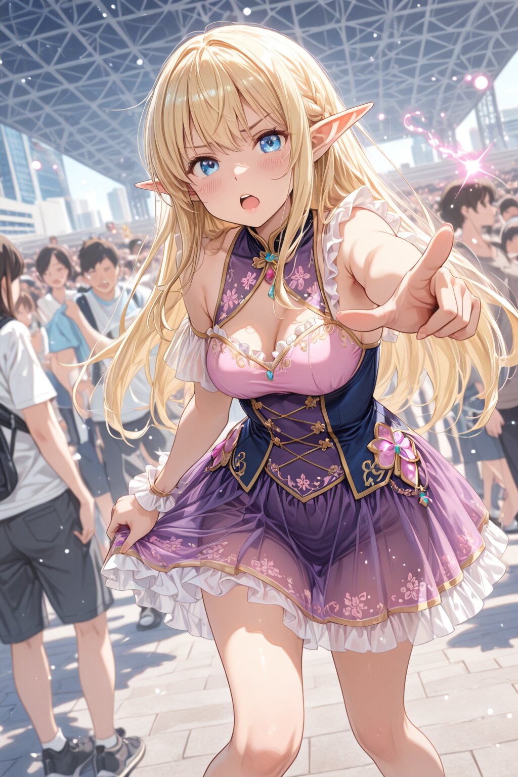(background is tokyo-bigsight), outdoors, noon, crowd, A blonde elf girl with long straight hair and blue eyes, (She is wearing a pink colored magic girl transformation dress with lots of frills made of transparent light and light particles, Lots of embroidery and light decoration, see-through, mini skirt). she is cosplayer, She is standing, from below, low angle. She holds down her skirt with one hand, while pointing at viewer. Slightly leaning forward, A slightly annoyed or warning expression, not overly angry but clearly calling attention to the situation. Low-angle, ger looking slightly down, but composed in a way that avoids any revealing view under the skirt. her Grabbing the hem of the skirt openmouth, five-finger, anime style, anime color,, <lora:elf-san_alpha1(AnimagineV31):0.7> <lora:elf-san_alpha4(IL1.0):0.7>, masterpiece, amazing quality, very aesthetic, high resolution, ultra-detailed, absolute, newest, 2d, semi-realistic, moe heroine, sharp focus,, soft lighting, rim lighting, volumetric light, lens flare, bokeh, ((Countless light particles floating around)), nice hand, perfect hand, perfect anatomy, five-finger,, beautiful eyes, ultra detailed lips, ultra detailed face and hair, kawaii, adorable, cute, medium breast, slim waist, wide hip,, kawaii, adorable, cute, elf girl, (apatite eyes with CGI effect), (deep blonde hair:1.2), medium breasts, wide hip,