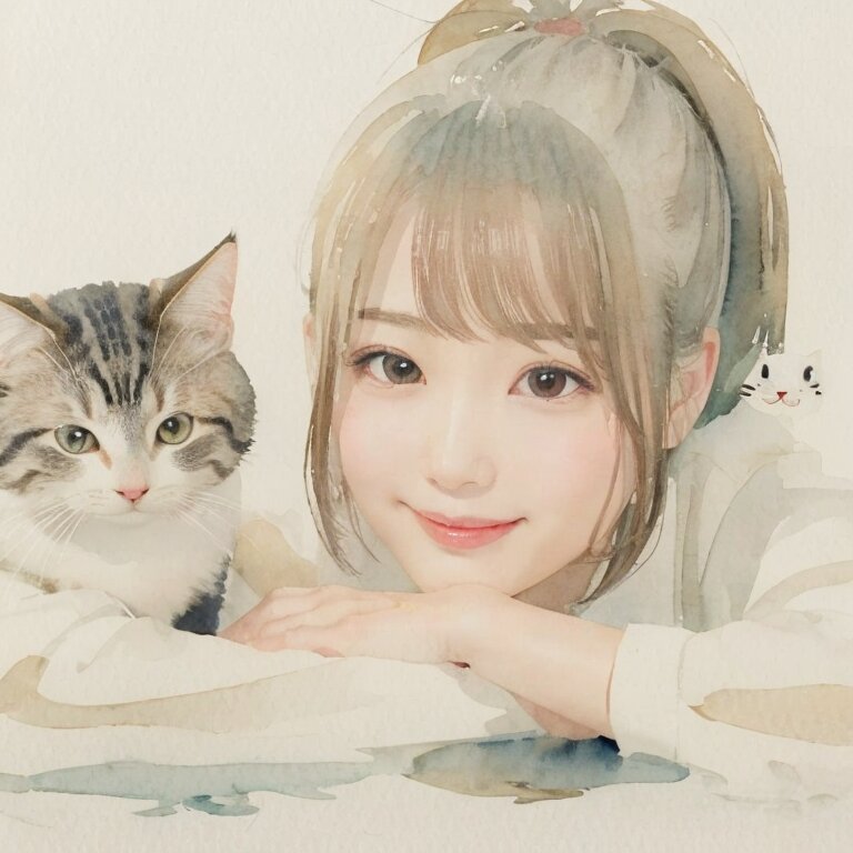 best quality, masterpiece, (water color painting:1.4), (line art:1.3), (illustration:1.2), (cel anime:1.1) Portrait, (full body:0.4), soft shadow, dramatic lighting, focus on face, japanese, 1 cute young girl,kawaii,(Brown bob:1.1), (surprised:1.0), (smile:0.8), (medium chest:1.0), beautiful eyes detail, (looking at viewer:1.4), (white) super fluffy, cat,