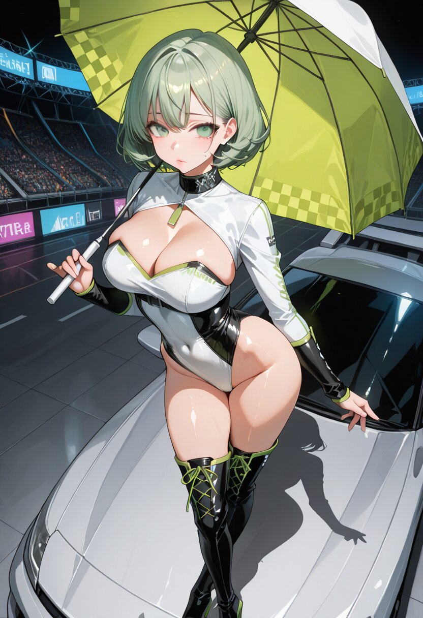 1lady,Shot from diagonally above, from the Ankle up shot,View from above,Night racing circuit,Pit lane,Race car(Turn directly to the side,1 unit), Belted bolero-style arm warmers(Closed neck,long sleeves),Silver base color with white gloss and green trim,,. Strapless bodysuit type(Silver base color with white gloss and green trim),(sides lace-up design,very high-cut leg openings,diamond-shaped cutout on the larger lower abdomen,),. high heeled thigh-high long boots(Silver base color with white gloss and green trim,Black and light green checkered insert),. groin line,femur line,,Erotic and intoxication eyes,Close her mouth,Slightly raise the corners of your mouth,,slender waist,Standing on the pit lane surface,racing car is positioned directly behind the lady(depiction of a part of the car body),Lady's posture(race queen pose,crossed legs Standing(contrapposto:1.2),),Holding a closed parasol with a racing design, Strike a pose towards us,She is using one arm to lift and emphasize the underbust area of both breasts,Leaning slightly forward),. (lady is light brown skin:1.0),,( lady is skin moist texture :1.6),,,Her skin has a deep warm texture that is unique to Japanese people. lady is 28 years old. lady hair style is fluffy bob hair,shiny green hair color,,.narrow eyes ,eyeballs are a clear moss green color,mole under the left eye(1 mole black), elastic lips, light pink lips, diamond-shaped features, slender features of a typical Japanese model,.rounded feeling of 3D modeling line,, . She is 168cm tall and her are bust 84cm, waist 54cm, hips 87cm, and an E cup. Oil painting illustrations of games from soft Engine,vibrant colors,intricate details, exotic lighting,atmosphere of a 3DCG art game,light shading,fine texture,,(4k,8k,Ultra HD), High-resolution illustration. Adult atmosphere.NSFW. Delicate and smooth oil painting.