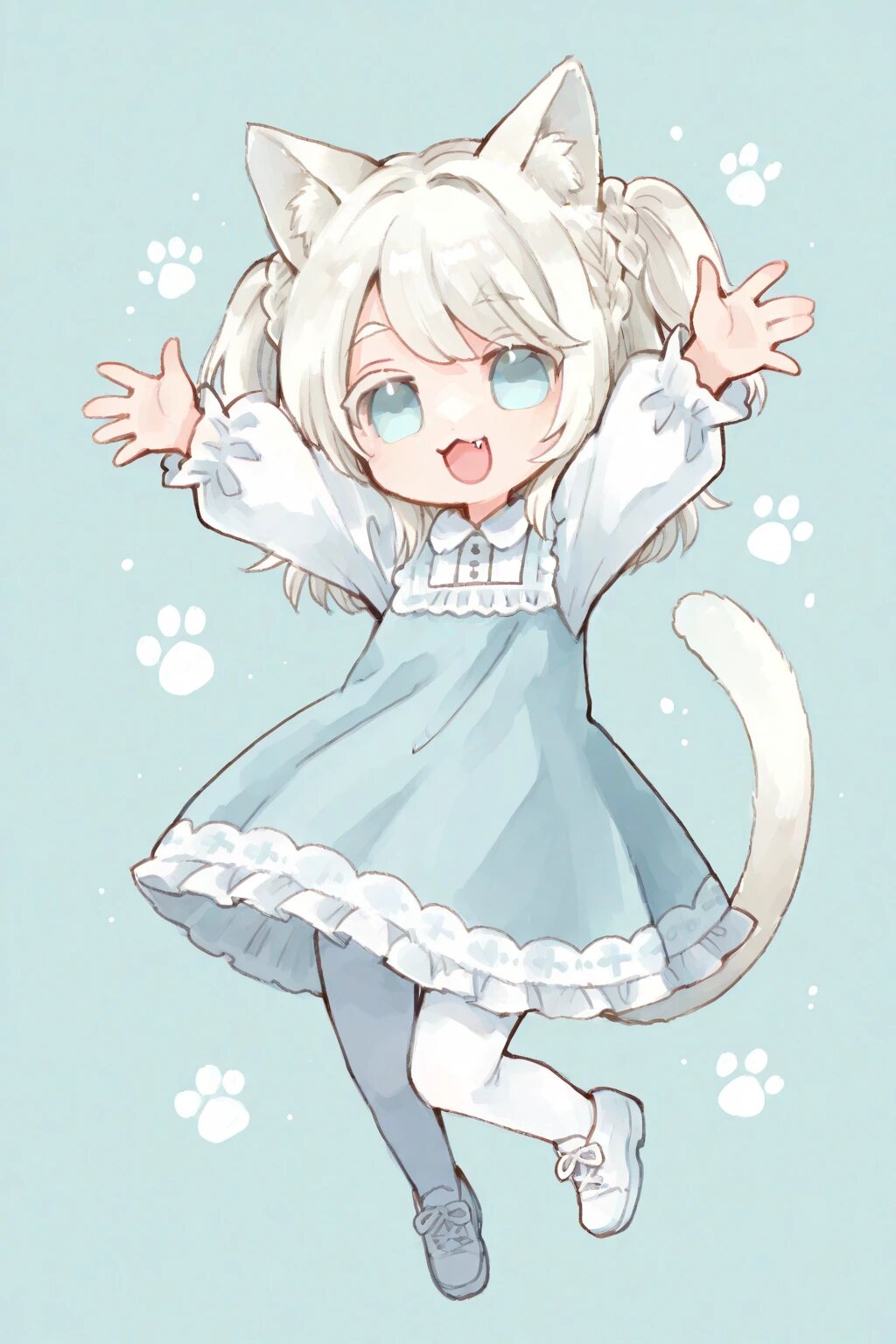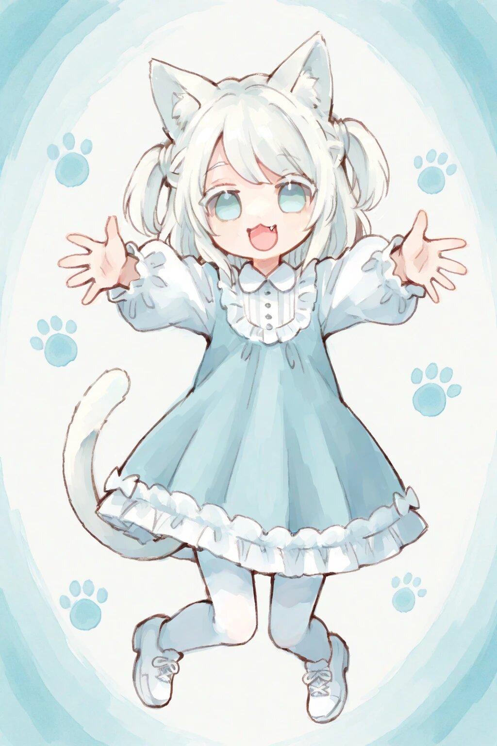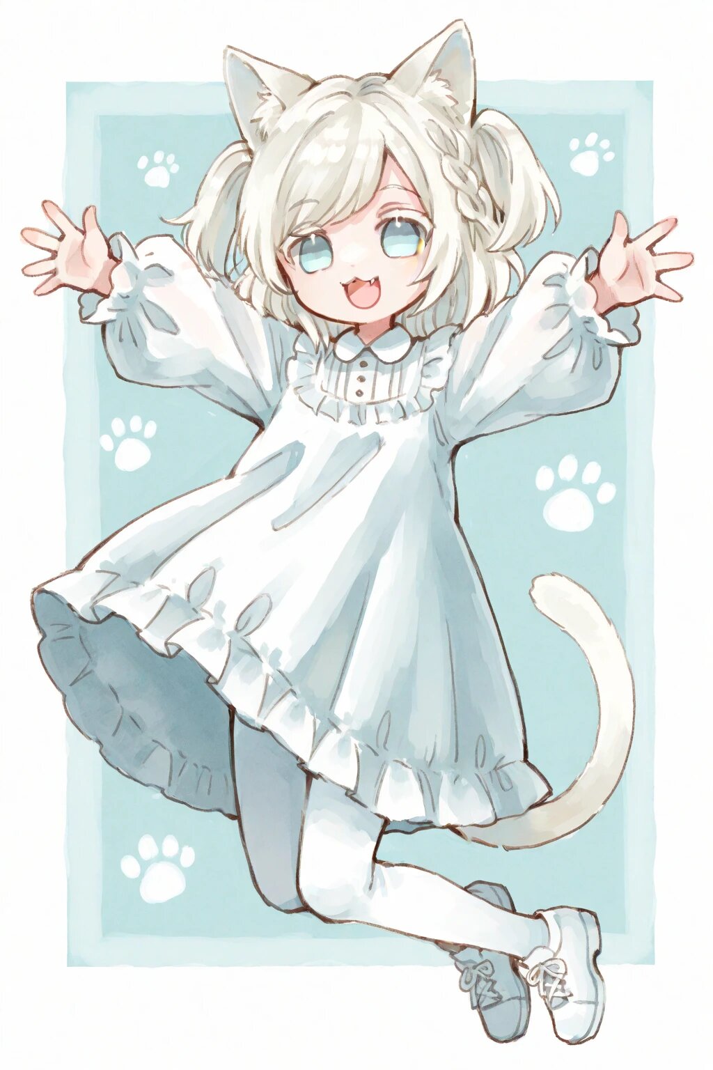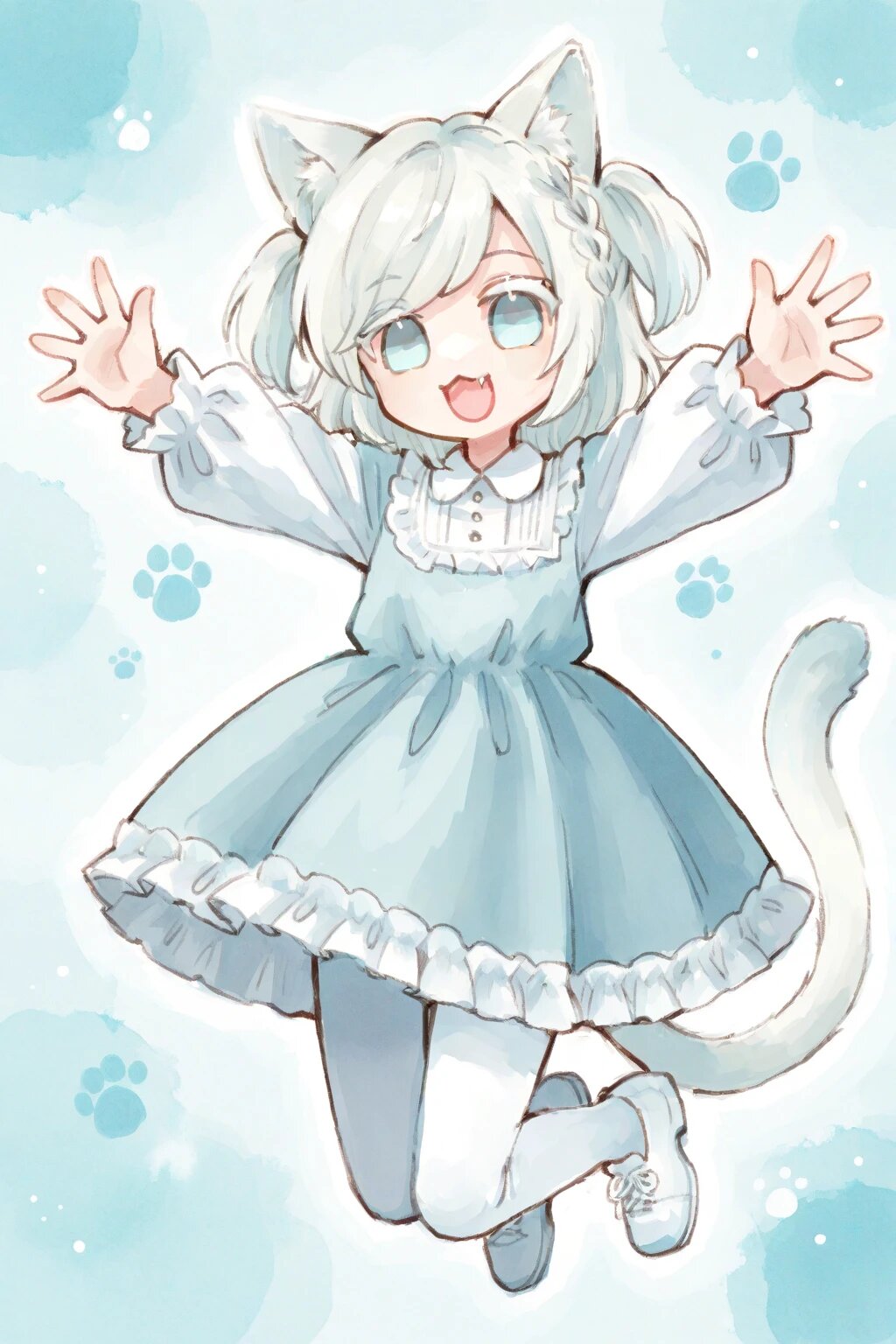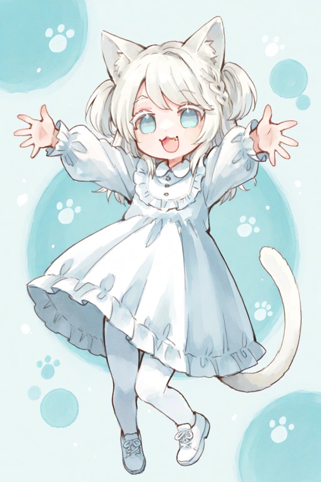 chibi, solo, 1boy, outstretched arms, outstretched hands, jump, legs up, white hair, two side up, medium hair, braid bangs, swept bangs, pale blue eyes, white colored eyelashes, :3, fang, white frilly longsleeves dress, white tights, white shoes, smile, open mouth, cat ears, cat tail, ultra-detailed, best quality, masterpiece, very aesthetic, watercolor painting, general
