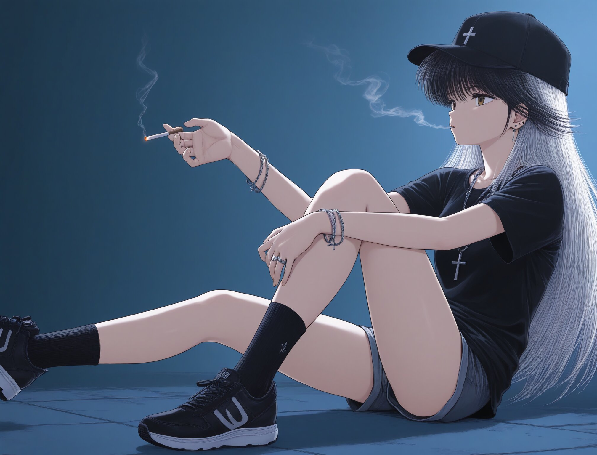 ,mdk_manga, brown eyes,long black hair, thick bangs, glossy hair,(ayukawa madoka:1.3), glossy skin, specular highlights, studio lighting, rim lighting, blue theme, 1girl, solo, long hair, shirt, hat, jewelry, sitting, white hair, earrings, shorts, shoes, socks, black footwear, necklace, bracelet, black shirt, black headwear, piercing, ring, black socks, cross, ear piercing, sneakers, baseball cap, cigarette, smoking, cross necklace, chain necklace masterpiece, best quality, ultra-detailed, 8k resolution, very aesthetic ,amazing quality, <lora:StS-Illustrious-Detail-Slider-v1.0:2> <lora:sdxl-hairdetailer_02:2> <lora:mdk_manga_illus_1024:0.6>