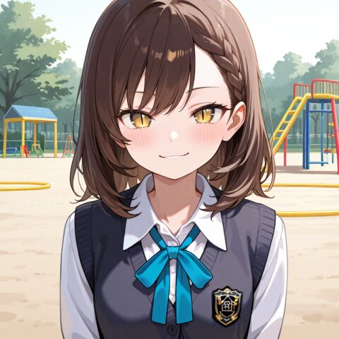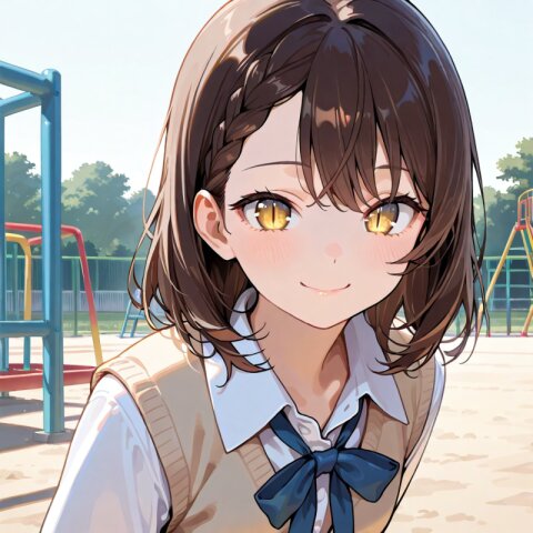 1girl, solo, masterpiece, best quality, high detail, dark brown medium hair, left side braided bangs, gold eyes, slit pupils, eye reflections, (mature face:0.6), upper body, straight-on, slight forward lean, laughing, big smile, open mouth, laughing expression, eyes closed, happy expression, relaxed brows, (open mouth:1.2), (big smile:1.1), (blush:0.6), energetic pose, slightly leaning forward, shoulders relaxed, navy cardigan vest, white blouse, blue neck ribbon, japanese school uniform, schoolgirl, high school, playground park, local park near residential area, small neighborhood park, quiet small city park, (cinematic lighting:0.4), slender body, (small breasts:0.8)