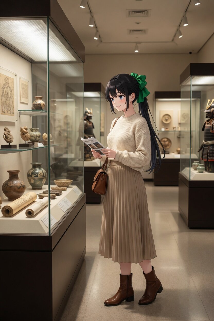日本人女性24歳のイラスト。博物館の中。多数の品物が展示されており、それを見ている。休日のお出かけ衣裳を着ている。グリーンのシュシュ。