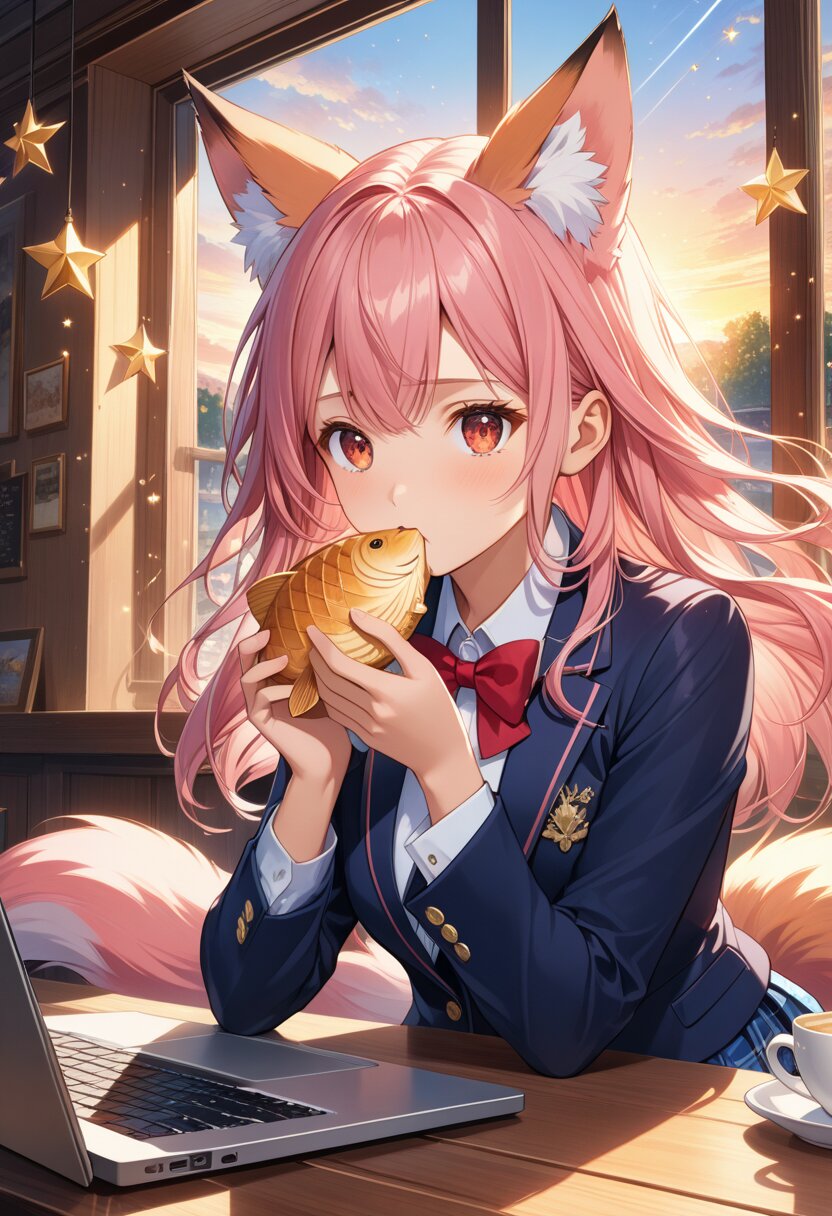 (high resolusion,illustration,ultra detailed 8k art,extremely detailed CG,official art,clothes reflecting light,detailed shiny skin,detailed background:1.3), ((highly detailed beautiful face and eyes),(anime style, fox ears, girl, pink long hair, double eyelids, long eyelashes, red eyes with stars, delicate facial features, focus on eyes, pink fluffy tail, navy blazer, red bow tie, blue plaid mini skirt, single leg garter:1.2), sitting at a cafe table, holding a taiyaki in her mouth, frustrated face, sparks coming out of a laptop, digital artifacts in the air, cafe background, sunset light through the window, high quality, masterpiece, funny atmosphere.