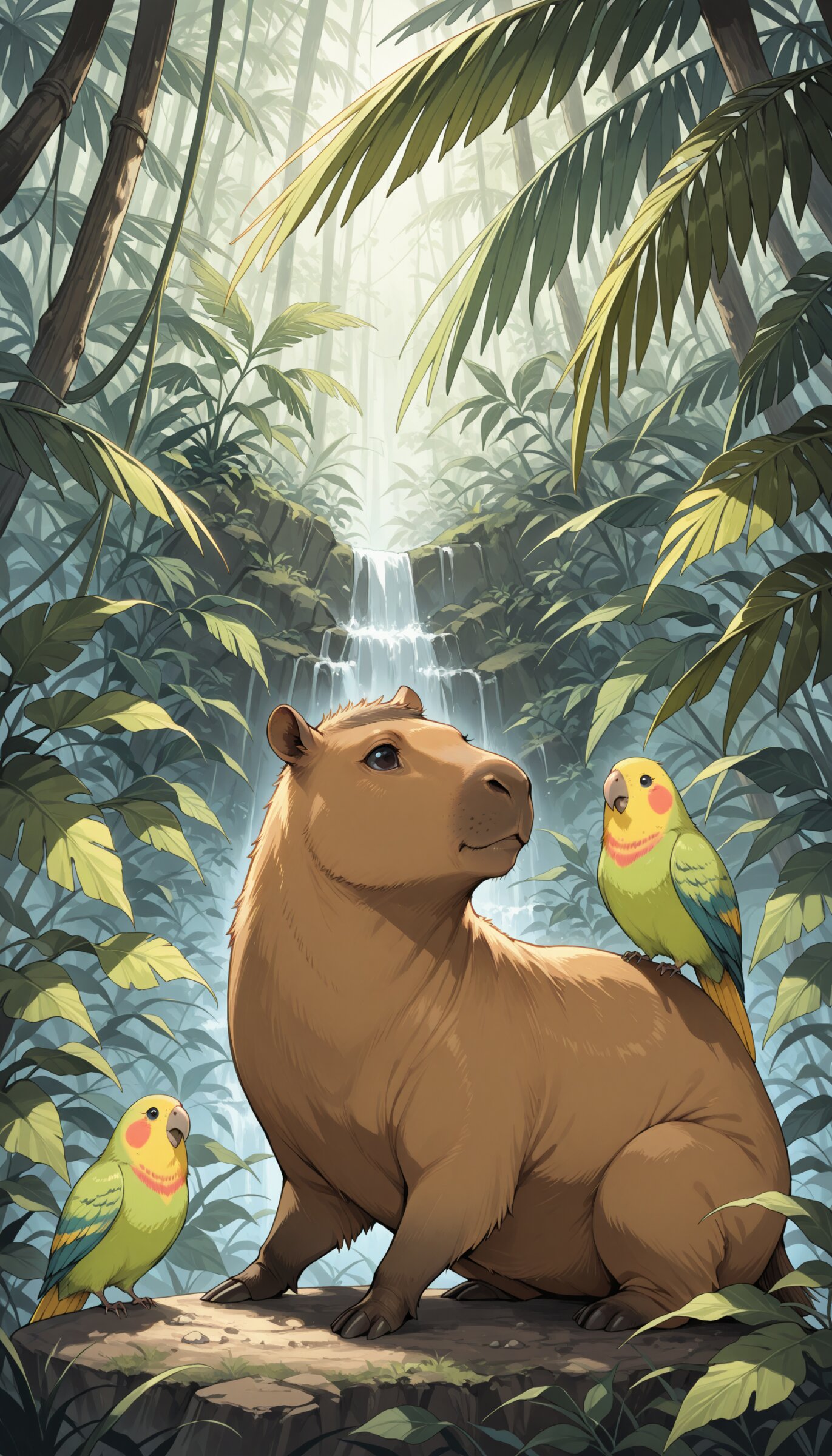 masterpiece, best quality, amazing quality, general, fine detail, official art, masterpiece, jungle, one Capybara, one parakeet, ((A parakeet is sitting on top of a capybara))