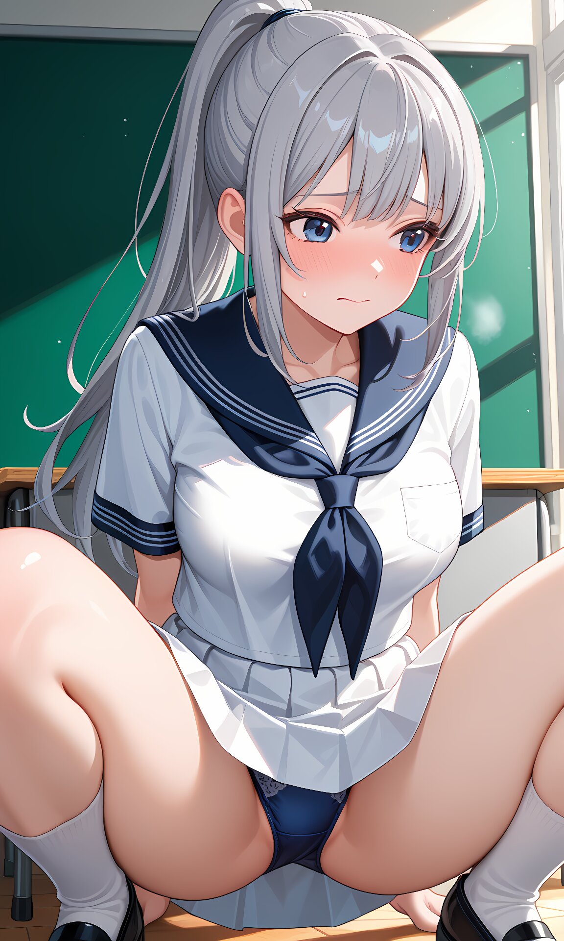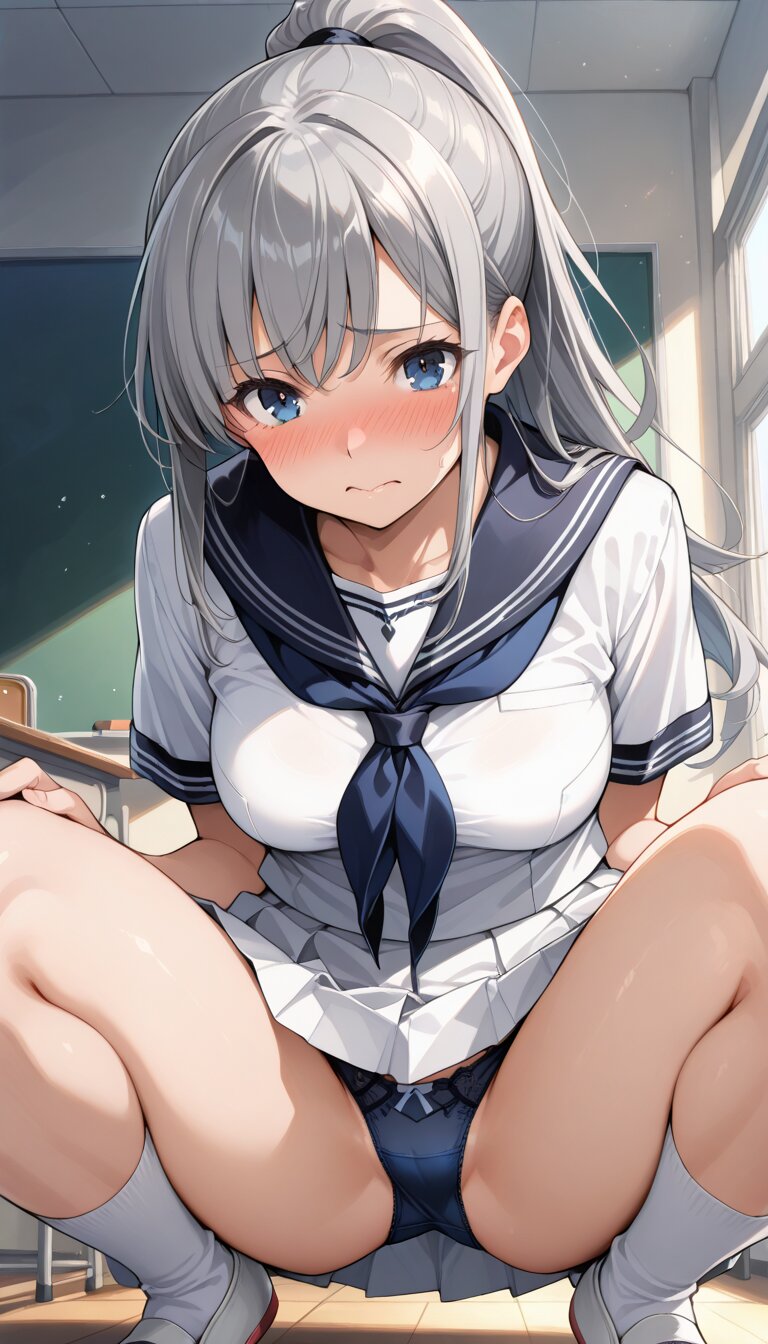 masterpiece,best quality,amazing quality,general, fine detail, official art, 1girl, cute face, crouching(crouch down), a squatting position, Sonkyo, (solo), 16 yo, bangs, (silver-grey hair:1.7), (long hair, ponytail:1.5), (dark-blue eyes:1.5), (beautiful eyes), (medium breasts), (school uniform), sailor uniform, dark blue sailor collar, white shirt, (dark blue neckerchief:1.3), sailor collar, (white skirt:1.3), pleated skirt, white socks, underwear, panties, dark blue panties, blush, (embarrassed:1.3), classroom, (doggy style, squatting, spread legs:1.3), best quality, masterpiece, extremely detailed CG unity 8k wallpaper,