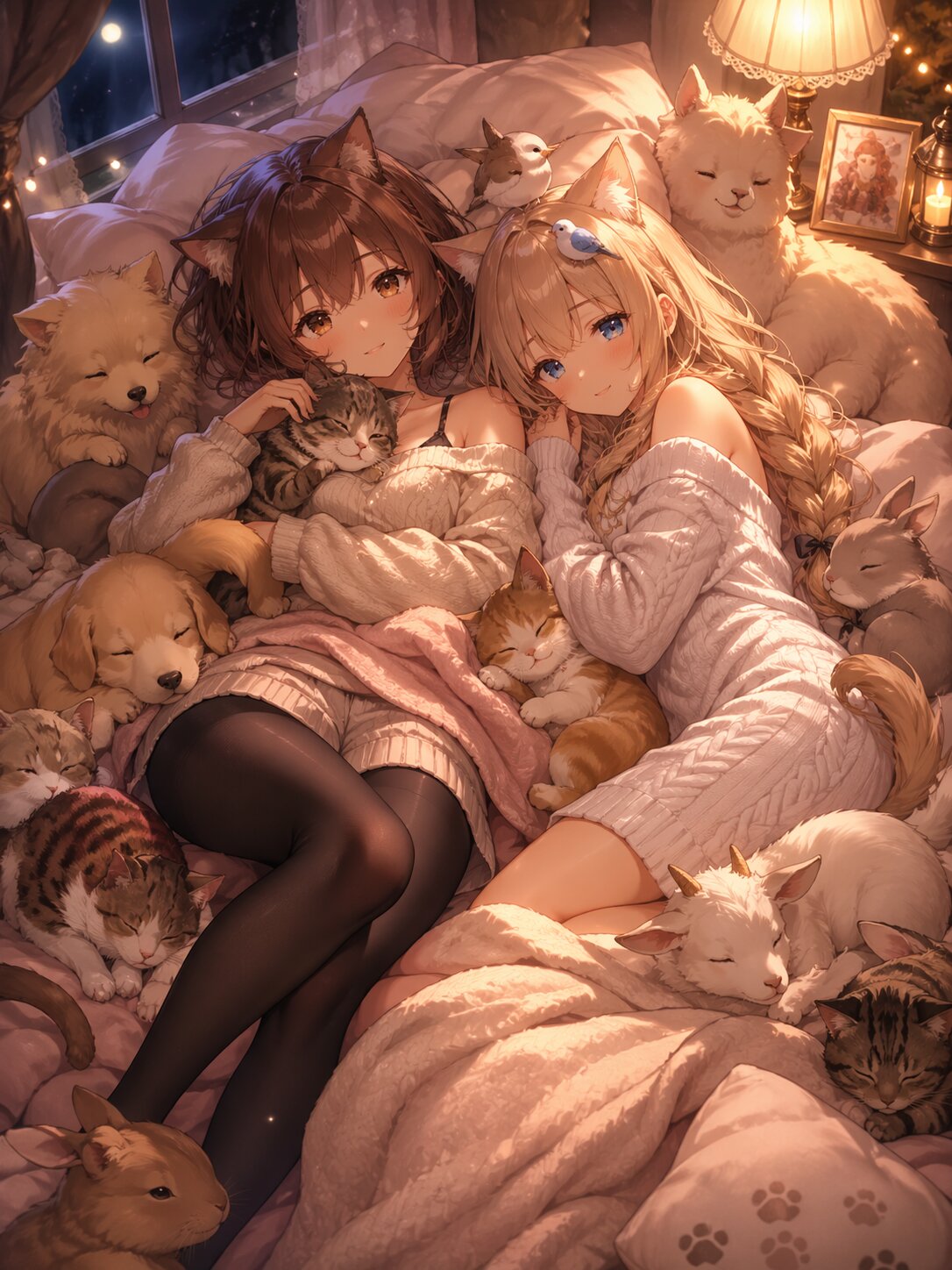 2girls, similar height, same age appearance, sisters, cat ears, natural small cat ears, natural cat tails, medium breasts, brown eyes, chestnut brown hair, wavy bob hair, loose inward curls, hair between eyes, blue eyes, long blonde hair, braid, hair between eyes, night indoor bedroom, large cozy bed, soft mattress, fluffy blankets, layered pillows, warm and intimate atmosphere, dim lighting, warm bedside lamp, soft glow, subtle moonlight through window, gentle shadows, slightly top-down view, close-up composition, tightly packed scene, extremely crowded composition, animals everywhere, overlapping bodies, tightly gathered around the girls, many animals, cats, small dogs, rabbits, alpaca, baby goats, birds, animals cuddling, sleeping, piling together, peaceful and relaxed mood, girl 1 wearing oversized loose knit sweater, short pants, black tights, relaxed posture, girl 2 wearing long knit sweater dress, soft fabric, elegant but relaxed, lying on the bed, surrounded by animals, partially covered by blanket, one girl gently petting a cat, the other leaning close, natural interaction with animals, soft smiles, sleepy expressions, half-closed eyes, drowsy atmosphere, floating dust particles in light, soft light bloom, subtle ambient glow, focus on softness and texture, detailed fabric wrinkles, fluffy fur, warm lighting glow, high detail, masterpiece, best quality, ultra detailed, soft shading, cozy lighting