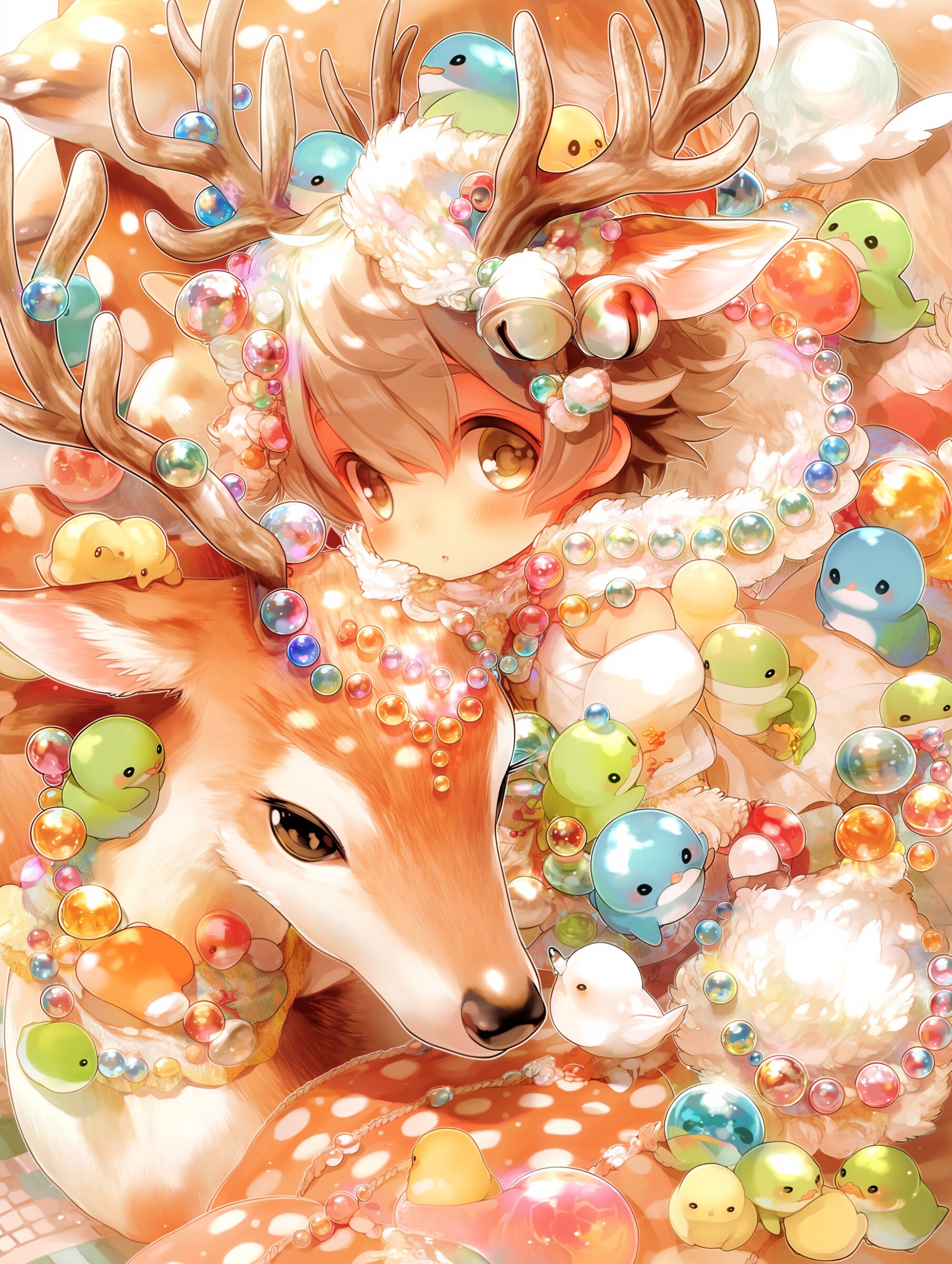 鹿ちゃんコンビをカラフルに彩っていて、にぎやかでかわいいです💖