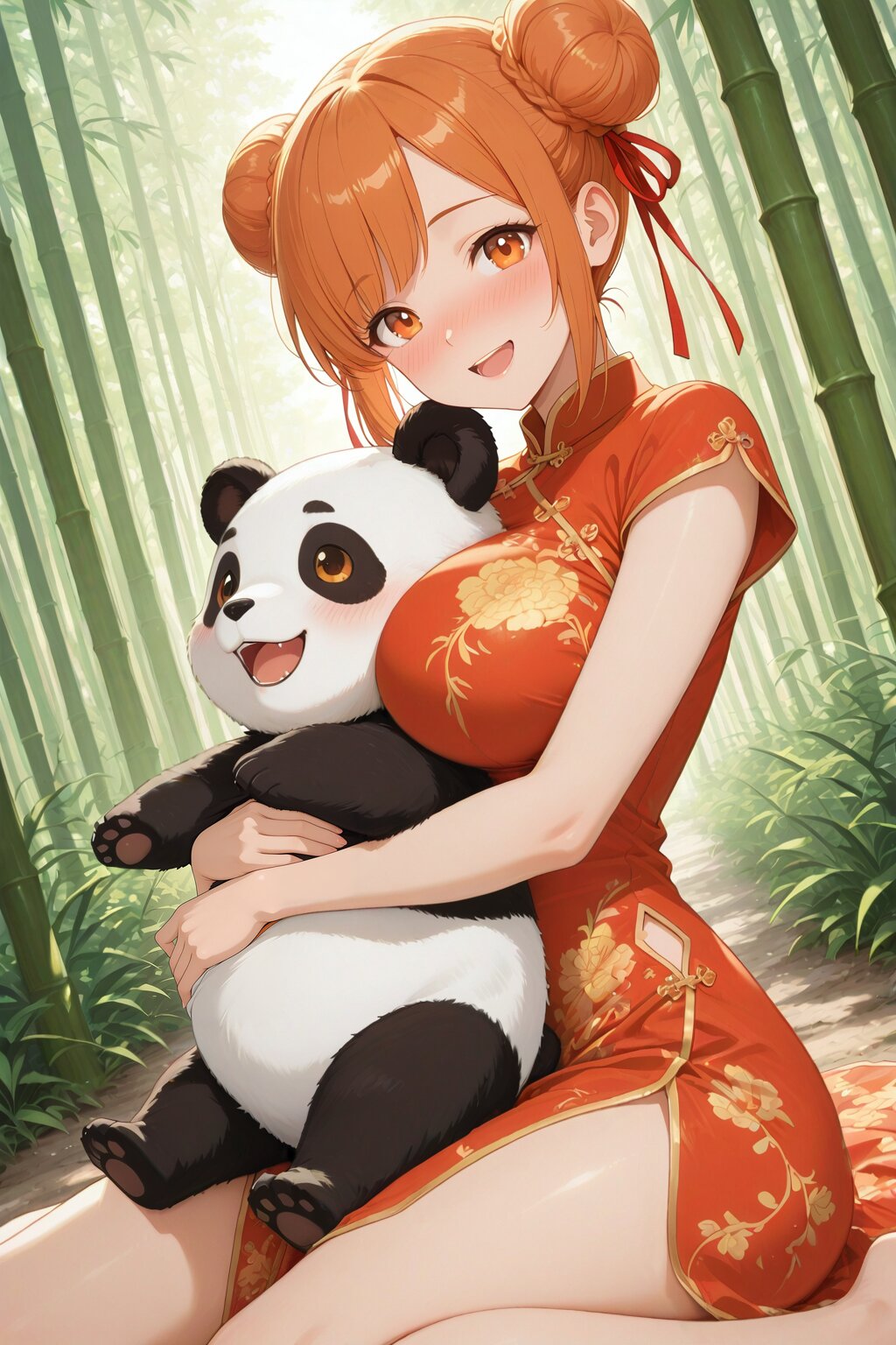 1girl, outdoor,forest of bamboo grass,(many large panda:1.3), large breasts,soft breasts,natural sag,(upward breasts), orange hair,(double bun),(parted bangs:1.3),sideburns,hair side red string ribbon,swept bangs,center flap bangs, large orange eyes,(tareme), nose blush,naughty smile,open mouth,joy, china dress, sitting,wariza,(large giant panda hug), cowboy shot,dynamic angle,looking at viewer,from side:0.8, BREAK anime style,detailed anime face, ((best quality)),amazing quality,((very high resolution)),very aesthetic,((ultra detailed)),absurdres, full color,extremely detailed CG,super fine illustration, high-quality face,extremely detailed face,symmetrical face,centered face, (beautiful eyes,detailed eyes,perfectly symmetrical eyes,sharp focus eyes), (perfect hands,detailed fingers,five fingers each hand), soft skin texture,natural skin pores,subtle skin imperfections,lifelike skin details,micro asymmetry,natural subsurface scattering, natural waist-to-hip ratio,balanced pose, dynamic cloth,detailed clothing texture,sharp focus,crisp details,intricate fabric texture, correct clothing physics,fabric folds following body,no clipping,anatomically correct proportions, mkn,