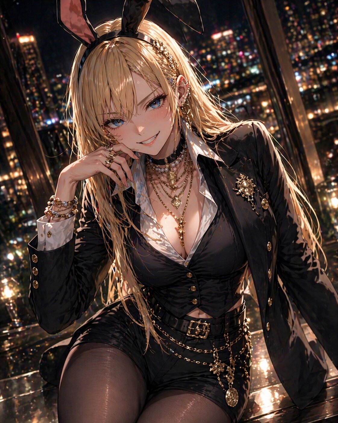 bunny girl, modern outfit, stylish bunny costume, black blazer, white shirt, slim fit vest, high-waist shorts, sheer tights, elegant design,(bunny ears), urban fashion, soft lighting, looking at viewer, (long blond hair), (blue eyes),(grin), gold layered necklaces, coin necklace, medallion pendant, filigree jewelry, baroque pearl necklace, pearl choker, gold hoop earrings, drop earrings, ear cuff, multiple piercings, gold brooch, decorative brooch, ornate buttons, cufflinks, gold waist chain, body chain, belt chain, ornate belt buckle, stacked bracelets, charm bracelet, pearl bracelet, gold bangles, multiple rings, gemstone rings, signet ring, hair jewelry, clean composition, etail, fine texture, subtle sheen, rim lighting, specular highlights, (dynamic angle:1.2),(masterpiece), best quality, very aesthetic,