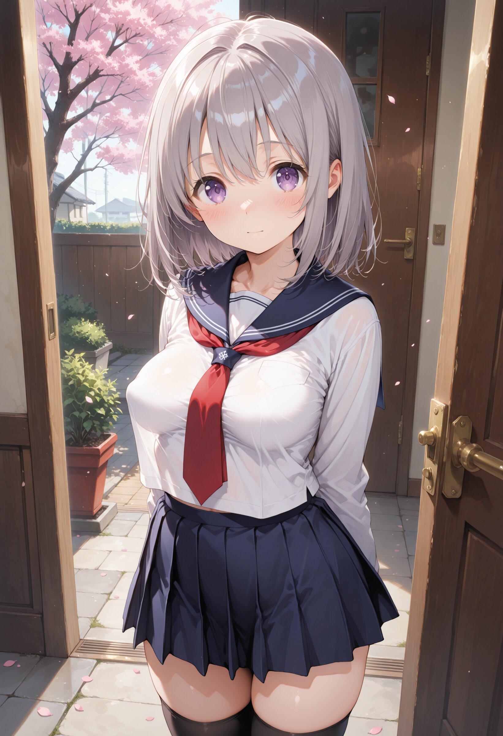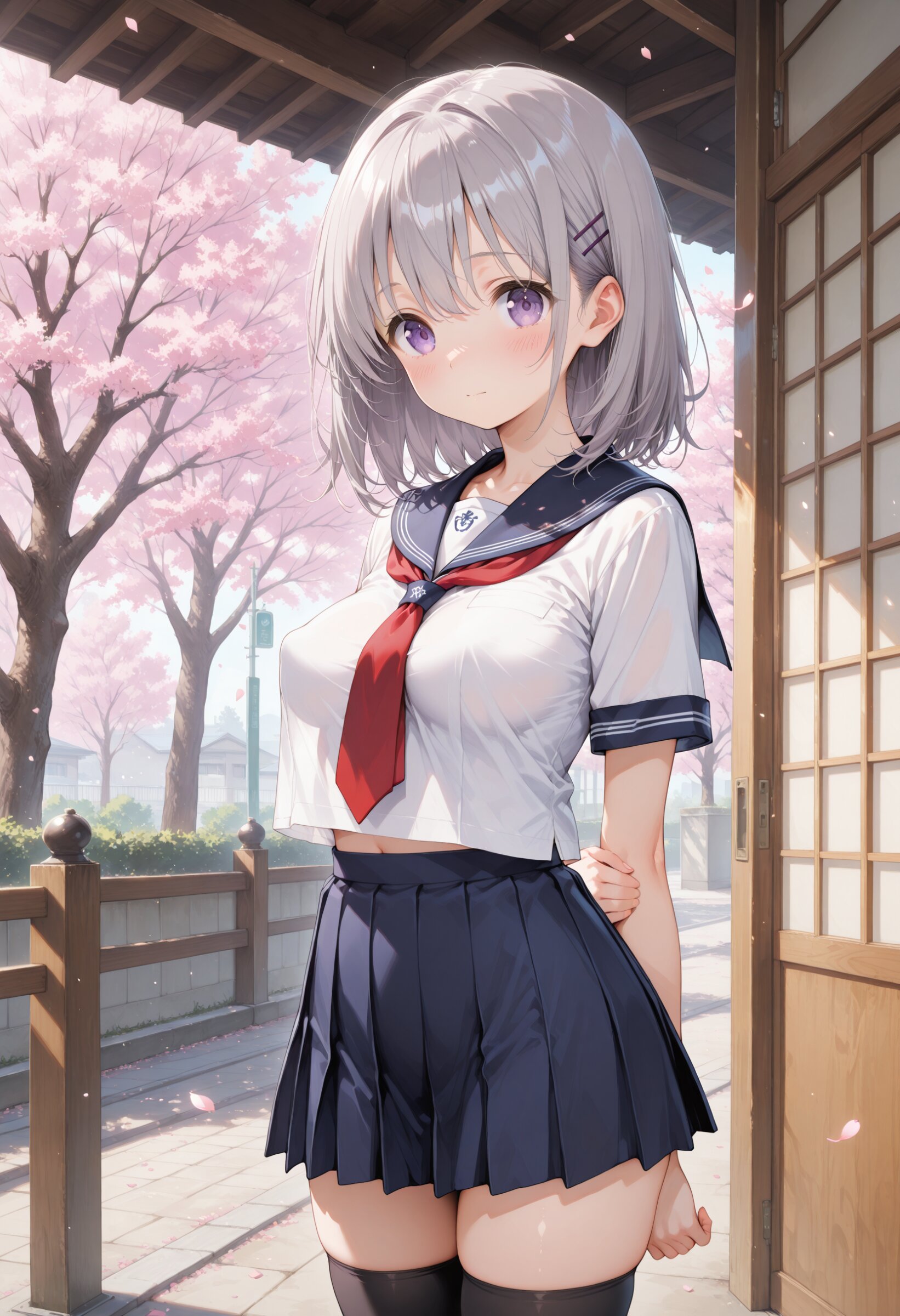 masterpiece, best quality, amazing quality, general, fine detail, official art, 1girl, loli, petite, high-school student, medium hair, silver hair, purple eyes, , (sailor collar), (white shirt), (red tie), (miniskirt), big breasts, impossible clothes, (perky breasts:1.2),Cherry blossoms, innocent expression, cowboy shot, , slim hip, black thighhighs, school entrance ceremony,