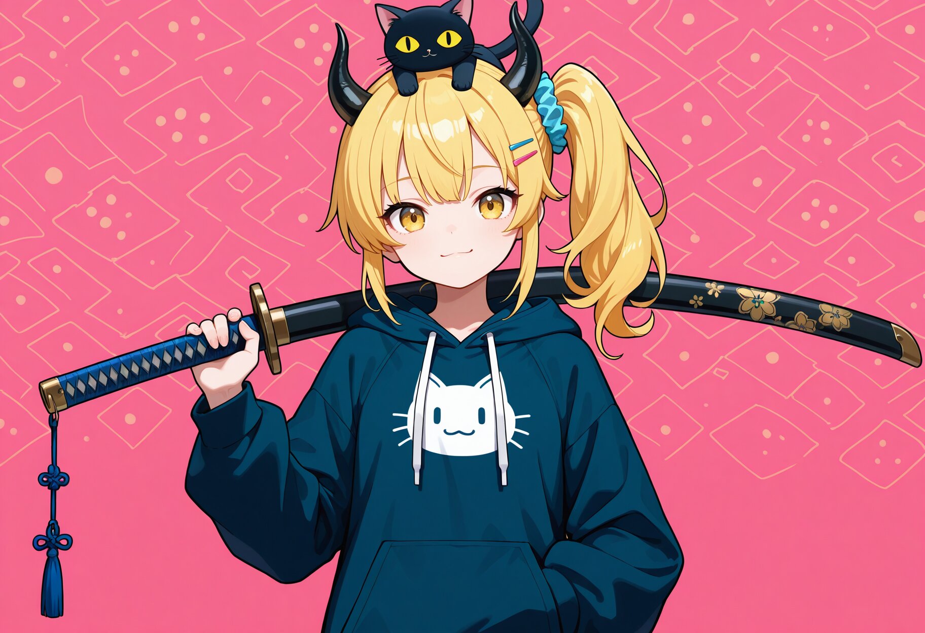 masterpiece,best quality,highres,ultra detailed,highly detailed,detailed eyes,perfect anatomy,general,1girl,solo,17yo,cute,(two demon horns,black horns,side ponytail:1.2),small breasts,blonde hair,long hair,bangs,hair scrunchie,colorful hairclip,yellow eyes,smile,demon girl,(long sleeves,cat clothes,cat kigurumi,hood down,hoodie),slender girl,BREAK portrait,cat on head,holding sheath,animal hands patterned sheath,over shoulder,front view,looking at viewer,fantasy,cute animal hands patterned background,hand in pocket,(katana:0.1),