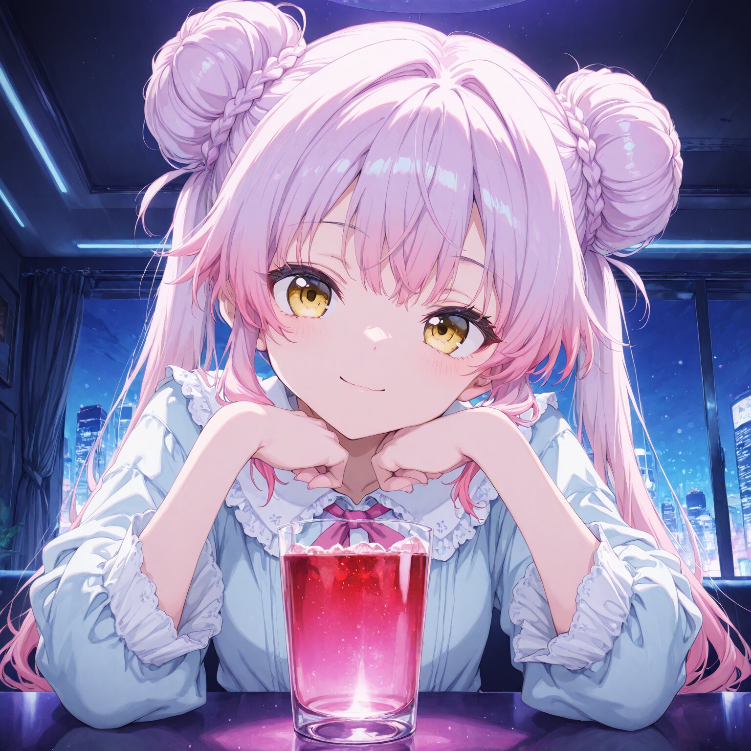 1girl light purple to light pink hair, gradient hair, long twintails with double bun, round eyes, yellow eyes Bar, glass on the table, detailed night club room, LED interior, colored light, dim lighting (Raising a glass), holding a glass BREAK, (newest, anime, animation, anime screen capture, anime style:1.3) BREAK, (masterpiece, , vibrant, very aesthetic, highly detailed, best quality, 16k:1.3)