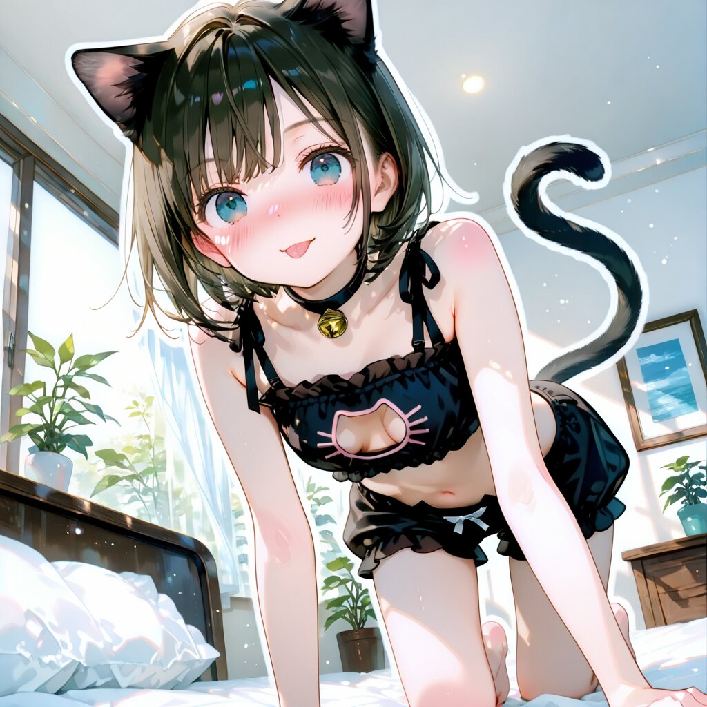 (realistic:0.7). 1girl, nose blush, cat lingerie, cat cut-out lingerie top, black lingerie, midriff, puffy shorts, all fours, tongue out, cat-ear hairband, black ears, cat long tail (white outline), curvy body, delicate skin, kawaii, cute, flat chest, slender, perfect anatomy, slim legs, (perspective, super dynamic angle from below), diagonal view.