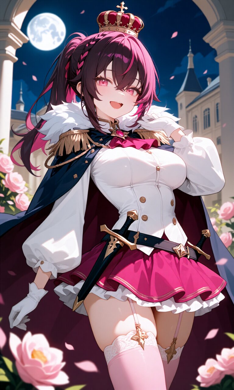 solo, a 14-year-old girl with dark pink hair styled in a long ponytail featuring a crown braid and crossed bangs. She has pink, slanted eyes and a cheerful, smiling expression, with a petite body featuring (big breasts:0.5), a narrow waist, and petite hips and legs. Her skin and face are delicate and intricately detailed, and her hair is vibrant and finely textured. She is dressed in a (White luxurious Prince costume:1.6) with long sleeves and a (luxurious Navy Cape:1.3), wearing a (luxurious Dark pink mini skirt:1.4) and (luxurious Light Pink thighhighs:1.3), accessorized with (luxurious White gloves:1.3) and a (luxurious crown:1.4). A (dagger on waist:1.3) is attached to her belt. She stands in a majestic outdoor setting with Rococo architecture, surrounded by blooming flowers under moonlight at night. The atmosphere is romantic and academic, reminiscent of a classic tale, with the style of the image being an anime masterpiece, best quality, with insanely detailed textures and beautiful 16k resolution.