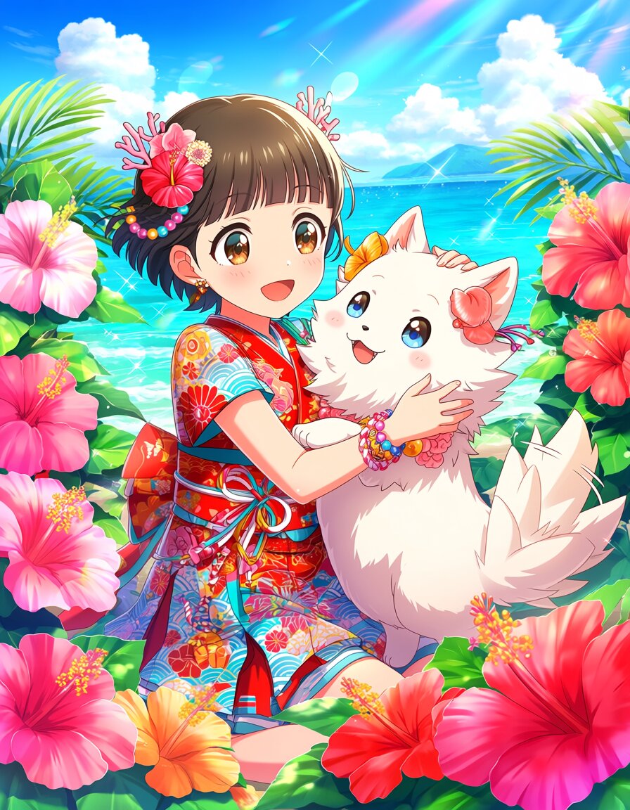 masterpiece, best quality, score_7, safe, 1girl, petite young girl, small stature, flat chest, delicate small build, innocent cute face, big expressive sparkling eyes, soft gentle smile, wearing traditional Okinawan Ryusou, colorful Bingata patterned two-piece attire, vibrant red and indigo base with intricate floral and tropical motifs, short-sleeved dujin top, pleated kakan skirt, lightweight flowing fabric, detailed hibiscus and wave patterns, neatly tied obi sash, cute coral and seashell hair ornaments, small gold earrings, colorful beaded bracelet, tiny flower hairpin, playing happily together with a living cute shisa, adorable living shisa creature, friendly mythical lion-dog spirit, big round expressive eyes, soft fluffy fur texture, small cute horns, gentle smiling open mouth, lively playful expression, tail wagging happily, girl gently petting the shisa's head, shisa playfully nuzzling against the girl, both looking at each other with joy and affection, warm mutual interaction, beautiful background with vibrant blooming hibiscus flowers in full bloom, large pink and red hibiscus blossoms surrounding them, lush green leaves, stunning turquoise beautiful Okinawan ocean (Mira Sea) in the distance, clear blue sky, bright sunny day, gentle waves, tropical paradise atmosphere, prism effects, subtle colorful light leaks, soft lens flare, rainbow light refraction, sparkling highlights, magical glowing atmosphere around the girl and shisa, vibrant colors, highly detailed, intricate clothing and fur details, perfect anatomy, no deformities