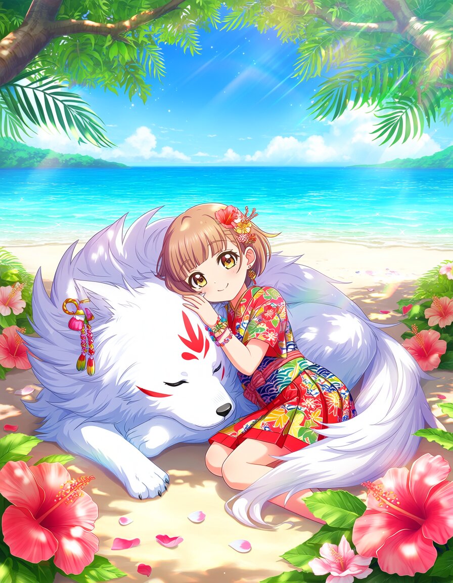 masterpiece, best quality, score_7, safe, 1girl, petite young girl, small stature, flat chest, delicate small build, innocent cute face, big expressive sparkling eyes, soft gentle sleepy smile, calm and peaceful sleeping expression, wearing traditional Okinawan Ryusou, colorful Bingata patterned two-piece attire, vibrant red and indigo base with intricate floral and tropical motifs, short-sleeved dujin top, pleated kakan skirt, lightweight flowing fabric, detailed hibiscus and wave patterns, neatly tied obi sash, cute coral and seashell hair ornaments, small gold earrings, colorful beaded bracelet, tiny flower hairpin, taking a peaceful nap together with a living cute shisa, adorable living shisa creature, friendly mythical lion-dog spirit, big round expressive eyes, soft fluffy fur texture, small cute horns, gentle calm sleeping expression, relaxed and content, girl lying down comfortably in the shade, gently cuddling with the shisa, head resting softly on the shisa's fluffy side or lap, one hand lightly placed on the shisa's back, shisa lying curled up beside her, both sleeping peacefully together, warm mutual affection, serene and cozy napping moment, soft breathing, beautiful dappled shade under lush hibiscus trees and large leaves, vibrant blooming hibiscus flowers in full bloom, large pink and red hibiscus blossoms gently surrounding them, scattered petals on the ground, lush green foliage providing cool shade, stunning turquoise beautiful Okinawan ocean (Mira Sea) visible in the distance through the trees, crystal clear water, white sandy beach, clear blue sky, bright sunny day but soft filtered sunlight in the shade, tropical paradise atmosphere, prism effects, subtle colorful light leaks, soft lens flare, rainbow light refraction through leaves, sparkling highlights, magical glowing atmosphere around the girl and shisa, vibrant yet soft and gentle colors, highly detailed, intricate clothing and fur details, perfect anatomy, peaceful composition, no deformities