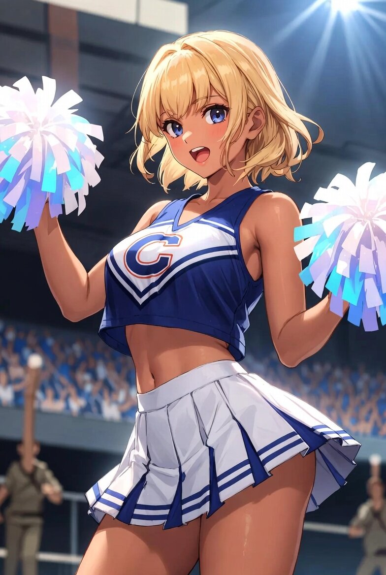 日本人女性24歳のチアリーダーのデジタルイラスト。金髪で健康的な日焼け。ポンポンを両手にもっている。背景はスタジアム。みんなを元気づけるポーズ。横からの構図。