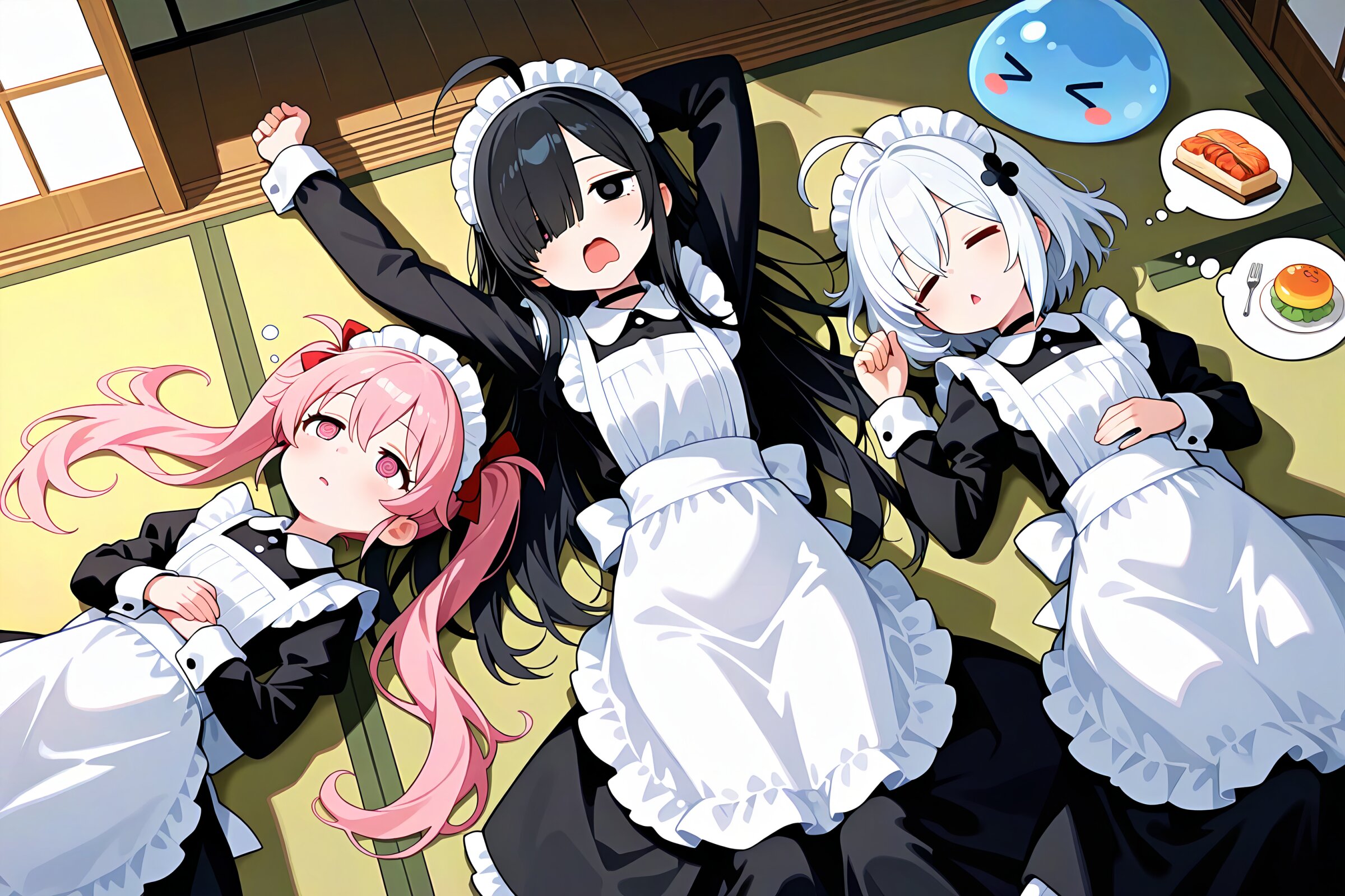 3 little girls, from above, masterpiece, best quality, amazing quality, very aesthetic, pink hair, twintails, pink eyes, =_=, @_@, sleepy, tearful, squeans, spoken squeans, lying on back, yawning, stretching, sleeping, choker, maid outfit, long skirt, hamsters on her head, > <, morning, japanese room, BREAK 3 little girls, from above, masterpiece, best quality, amazing quality, very aesthetic, black hair, long hair, ahoge, (hair over one eye:1.2), black eyes, =_=, @_@, sleepy, tearful, squeans, spoken squeans, lying on back, yawning, stretching, sleeping, choker, maid outfit, long skirt, ghost on her head, > <, morning, japanese room, BREAK 3 little girls, from above, masterpiece, best quality, amazing quality, very aesthetic, white hair, short hair, =_=, smile, cheerful, happy, chestnut mouth, lying on back, sleeping, spoken zzz, zzz, saliva, spoken food, thought bubble, choker, maid outfit, long skirt, slime on head, > <, morning, japanese room,