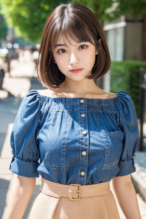 masterpiece, 16K, hyper detailed illustration, extremely detailed CG, BREAK Japanese woman, 23yo, cute, pretty, almond eye, round face, low nose, hyper detailed face, hyper detailed eye, beautiful eye, medium hair, bangs, hyper detailed hair, perfect anatomy, perfect proportions, hyper detailed body, blouse, short skirt, hyper detailed, city, hyper detailed background,