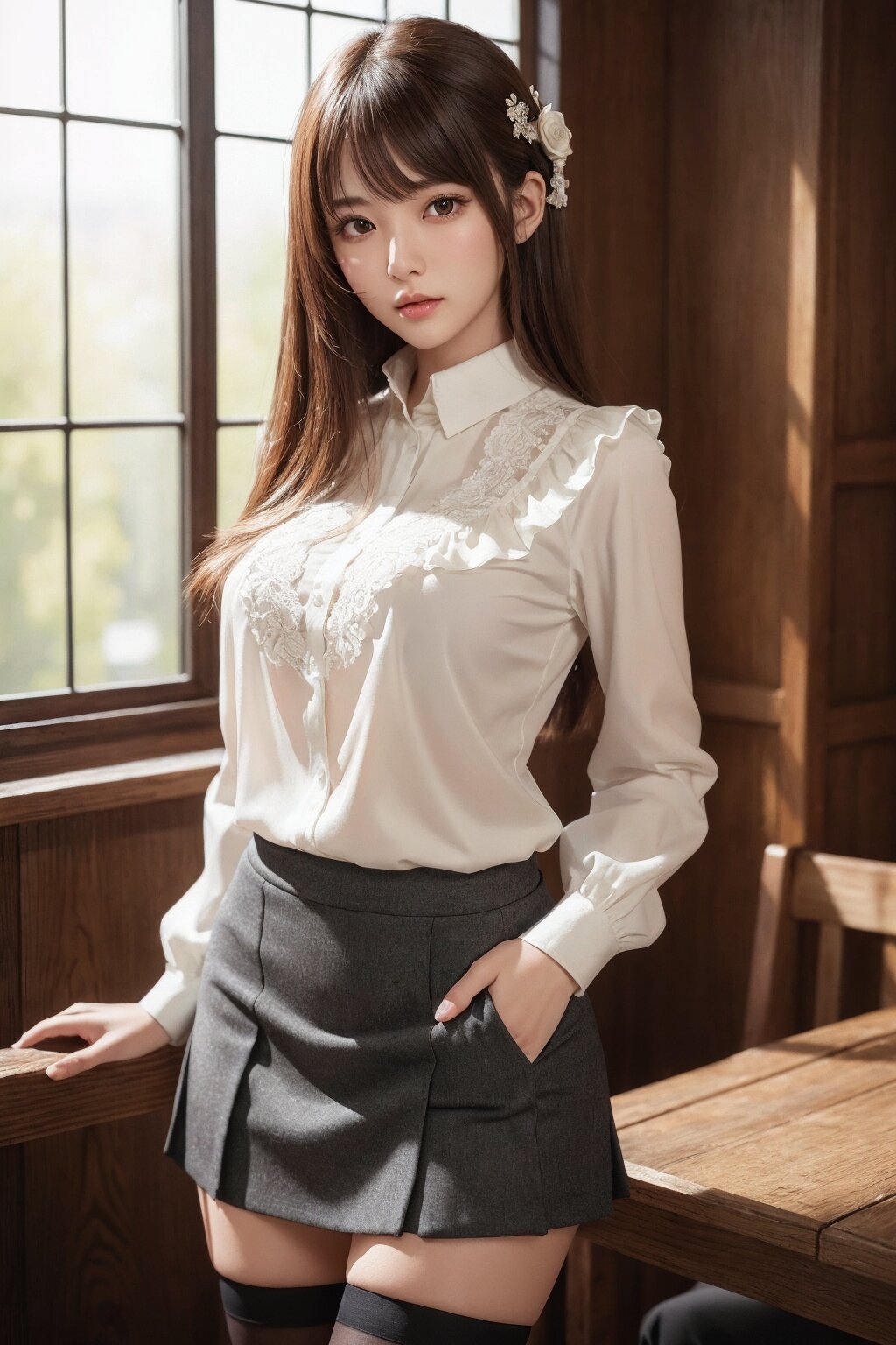 masterpiece, hyper detailed, 8K, hyper detailed illustration,extremely detailed CG, Japanese woman, 23yo, (cute:1.1), (pretty:1.1), hyper detailed face, hyper detailed eye, beautiful eye, extremely detailed, medium hair,(bangs:1.1), thin, tall, perfect anatomy, perfect proportions, extremely detailed body, blouse, short skirt, thighhighs, hyper detailed background,