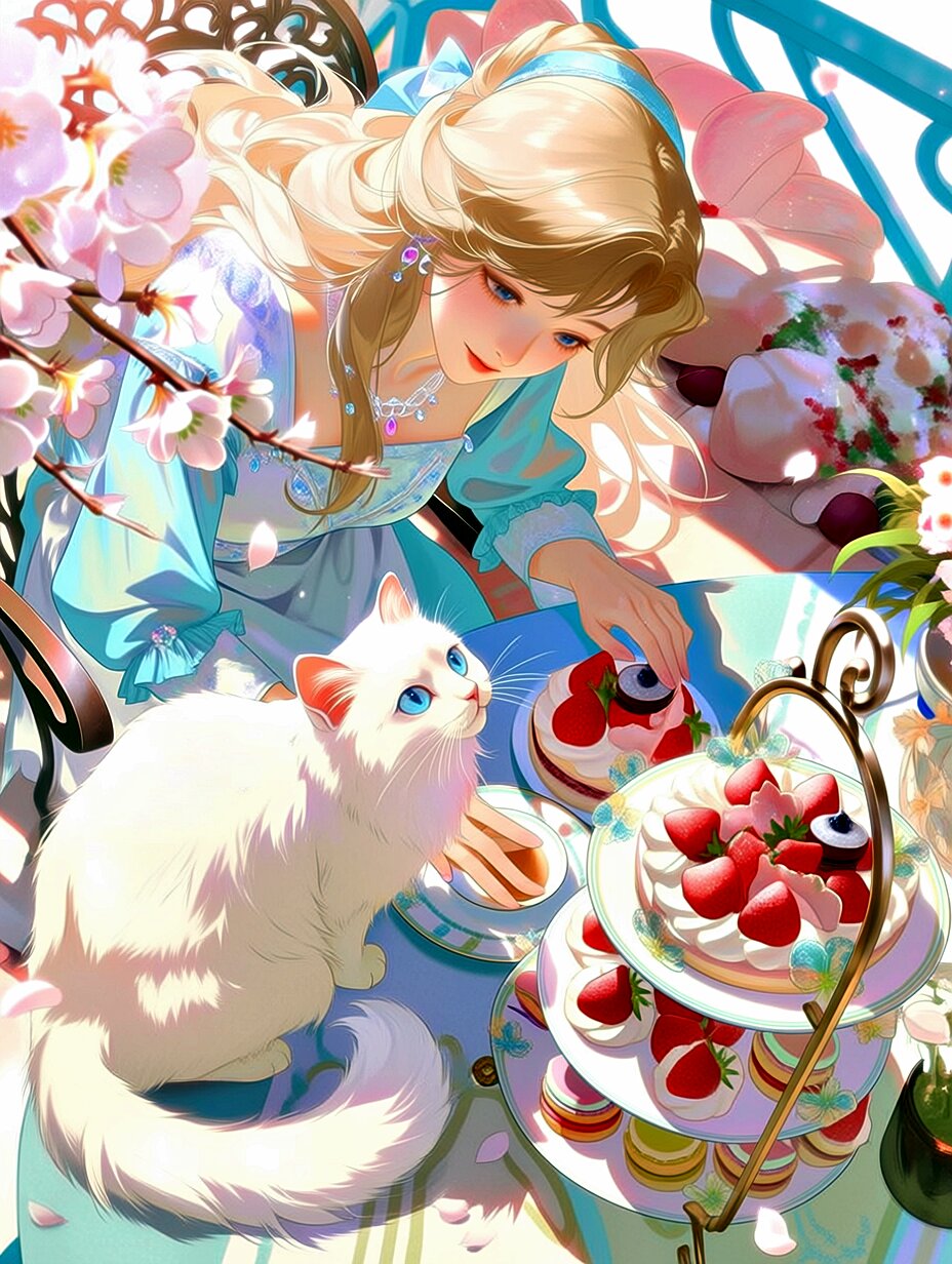 Digital illustration, Elegant and artistic illustration. A breathtaking cinematic view of a spring afternoon tea terrace cafe glowing in soft golden sunlight, featuring a graceful blonde woman sitting beside a beautiful white cat with radiant blue eyes at a pastel table filled with strawberry-themed desserts. Fresh strawberries shine like jewels atop elegant shortcakes and macarons arranged on a delicate tiered stand, becoming the vibrant focal point of the composition. The blonde woman has soft flowing hair illuminated by warm spring light, a gentle smile full of healing warmth, and a light pastel dress that moves slightly in the breeze. The white cat with luminous blue eyes gazes happily toward the strawberries, its fur softly glowing in the sunlight. Cherry blossom petals drift through the terrace air, surrounded by blooming flowers and airy garden elements. The scene is painted in ultra-detailed, poetic anime style with translucent watercolor textures, glowing light particles, and luminous pastel tones that feel both soothing and uplifting. The background is layered with cinematic depth, soft atmospheric gradients, and a dreamy emotional glow. 1ultra-high resolution, cinematic lighting, extremely detailed background, soft glow, emotional and lyrical atmosphere.