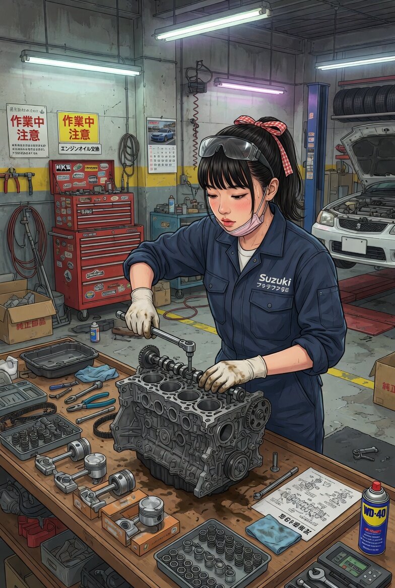 日本人女性20歳のデジタルイラスト。自動車用エンジンを組み立てている。背景は自動車整備スペース。