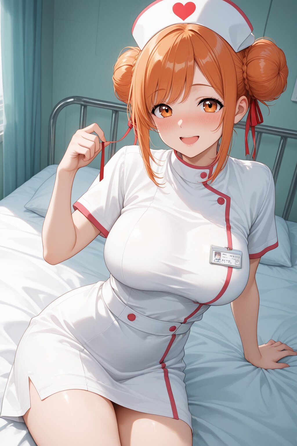 1girl, hospital,(bloom,sunlight),bed, large breasts,soft breasts,natural sag,(upward breasts), orange hair,(double bun),(parted bangs:1.3),sideburns,hair side red string ribbon,swept bangs,center flap bangs, large orange eyes,(tareme), nose blush,naughty smile,open mouth,kind,happy, white nurse,nurse cap,h,nameplate, sitting on hospital bed, cowboy shot,dynamic angle,looking at viewer,from side:0.8, BREAK anime style,detailed anime face, ((best quality)),amazing quality,((very high resolution)),very aesthetic,((ultra detailed)),absurdres, full color,extremely detailed CG,super fine illustration, high-quality face,extremely detailed face,symmetrical face,centered face, (beautiful eyes,detailed eyes,perfectly symmetrical eyes,sharp focus eyes), (perfect hands,detailed fingers,five fingers each hand), soft skin texture,natural skin pores,subtle skin imperfections,lifelike skin details,micro asymmetry,natural subsurface scattering, natural waist-to-hip ratio,balanced pose, dynamic cloth,detailed clothing texture,sharp focus,crisp details,intricate fabric texture, correct clothing physics,fabric folds following body,no clipping,anatomically correct proportions,