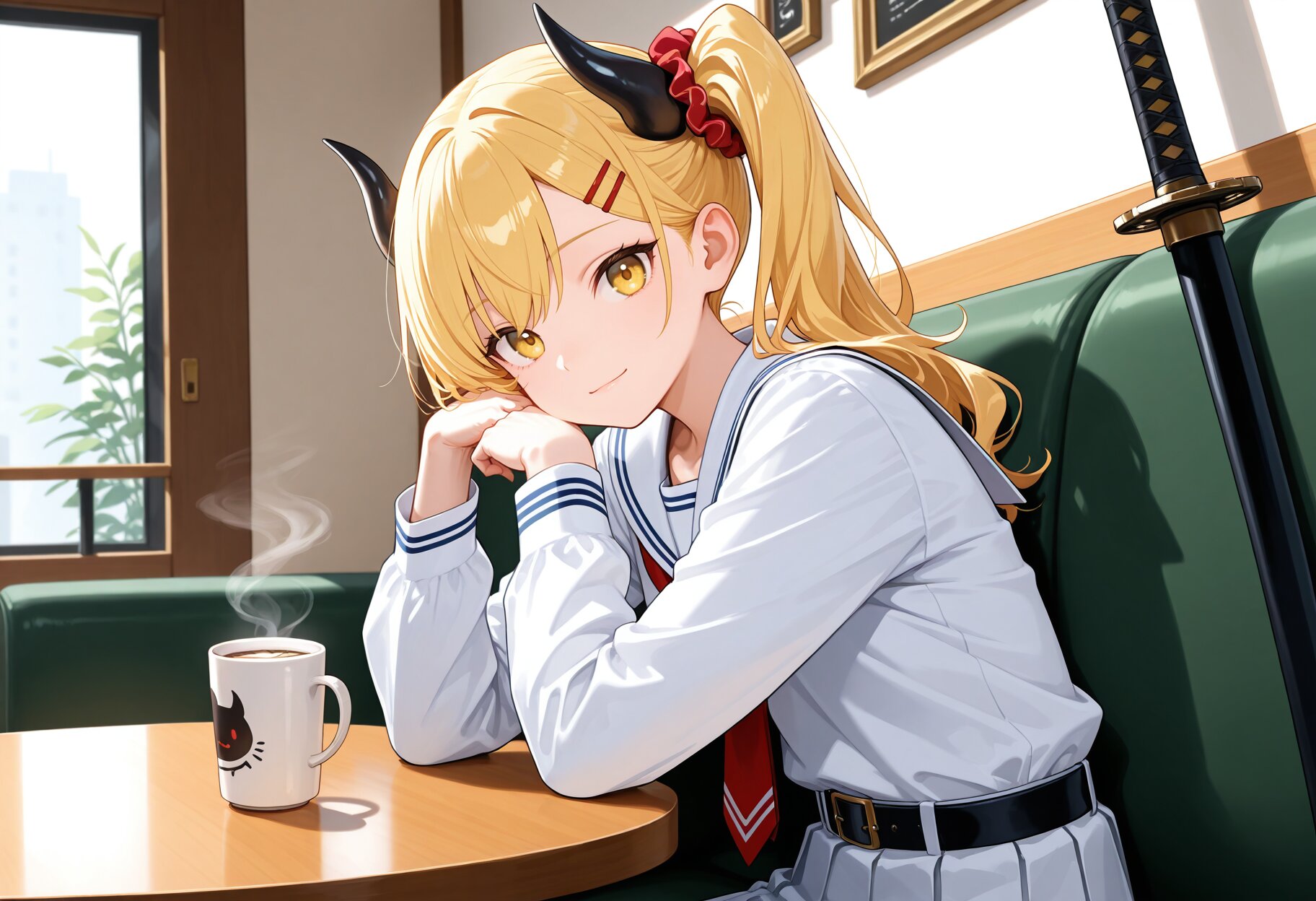 masterpiece,best quality,highres,ultra detailed,highly detailed,detailed eyes,perfect anatomy,general,1girl,solo,17yo,cute,(two demon horns,black horns,side ponytail),small breasts,blonde hair,long hair,bangs,hair scrunchie,hairclip,yellow eyes,light smile,closed mouth,demon girl,(long sleeves,long white serafuku,red part tie),belt,slender girl,BREAK portrait,close-up,looking at viewer,holding a cup of hot coffee,sitting sofa,table,cafe,in cafe,fantasy,sheath leaning on wall,katana,