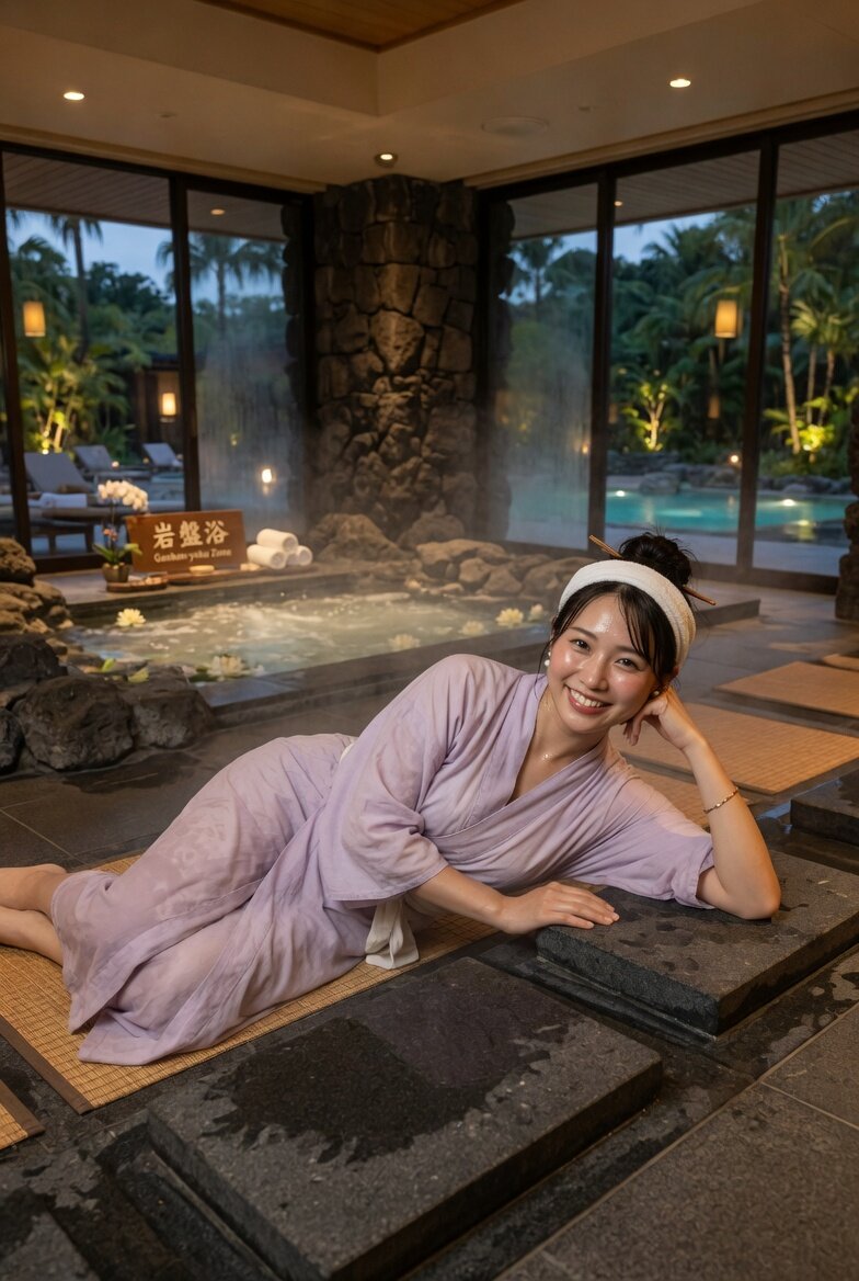 日本人女性25歳のリアルな写真。プロのカメラマンによる撮影のような仕上がり。岩盤浴をしていてリラックスしている。視線は撮影者を見て、笑顔。リゾートホテルの施設。