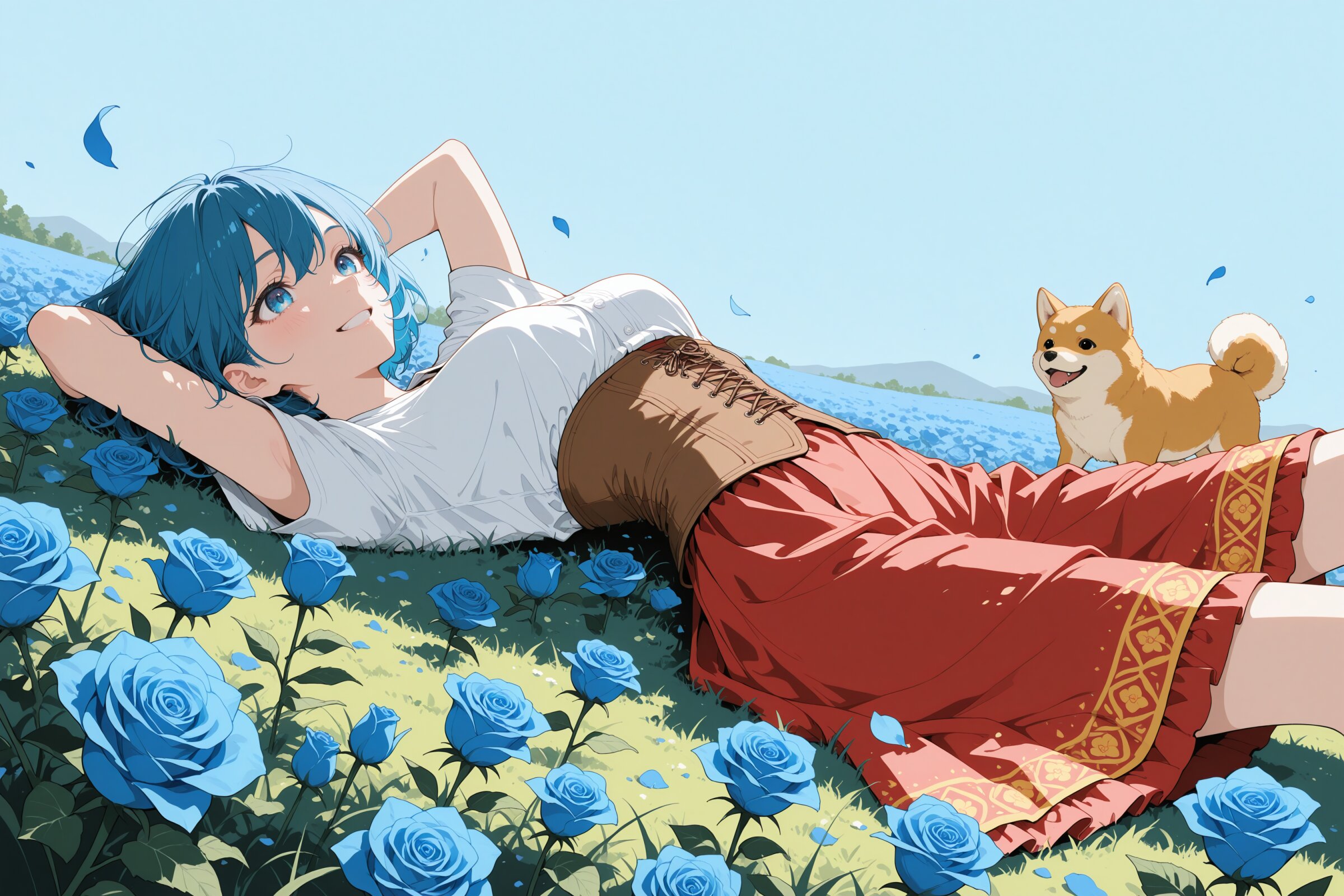 from below,from side,wide angle, masterpiece, best quality, amazing quality, very aesthetic, absurdres,newest, watercolor, newest,cute,(flat color:1.55),flat color lineart,,three-layer composition,meadow,(field:1.2),blue blue sky, in a vast blue rose garden, rose petals and grass on the ground, deep blue petals,sun-dappled lighting, 1girl,blue eyes,blue hair, short hair, medium breasts, Western traditional clothes, colorful cloth, white shirt, brown corset, red long tiered skirt, lying on back, smiling, splayed hair, crossed arms behind head,shiba inu,