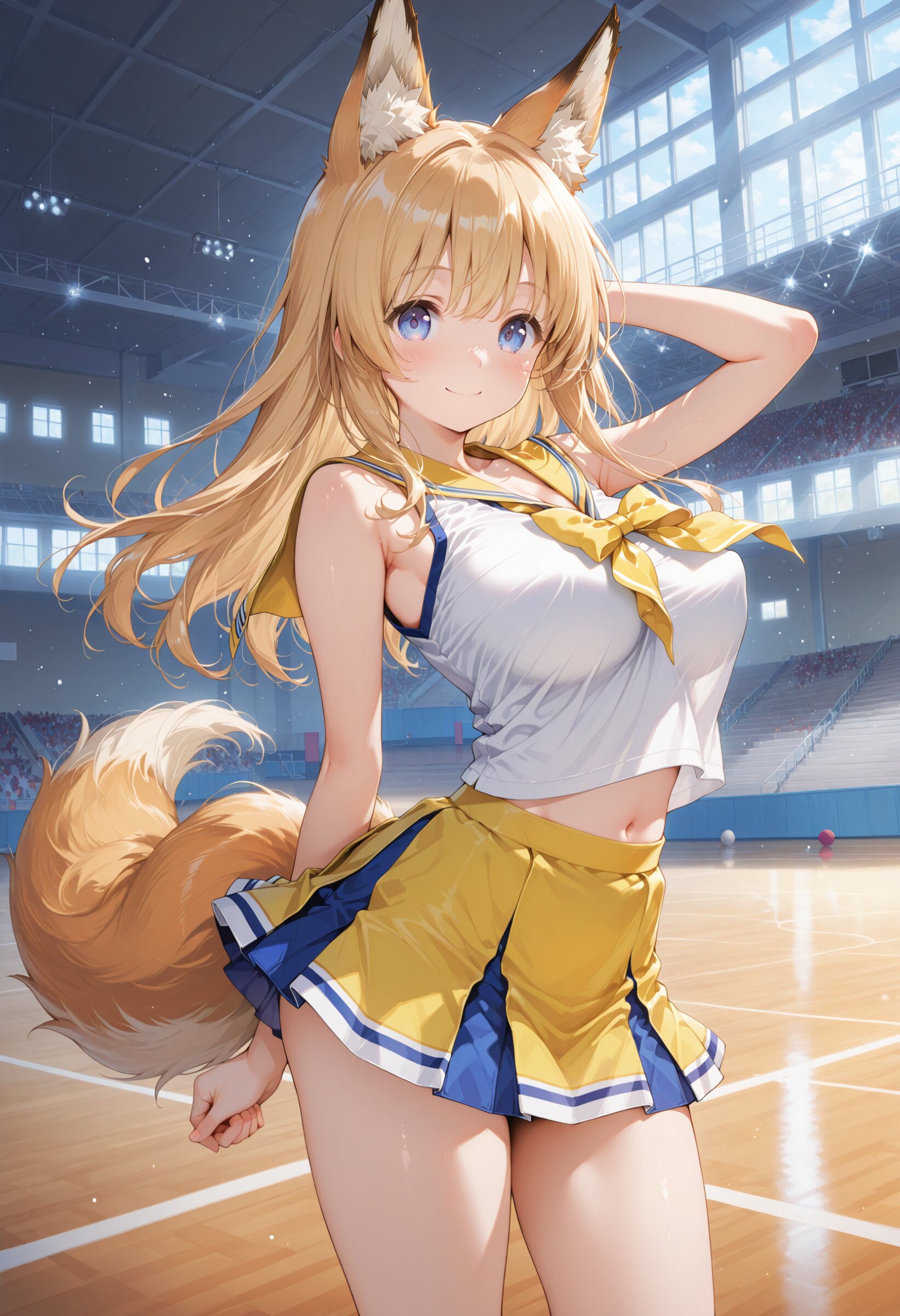 masterpiece, best quality, amazing quality, general, fine detail, official art, 1girl, loli, petite, beautiful hair, beautiful eyes, cheerleader, fox ears, fox tail, blonde hair, yellow sailor collar, yellow miniskirt, sleeveless, cleavage between sailor collar, midriff peek, beautiful legs, big breasts, (perky breasts:1.2), school gym, innocent expression, smile, dance, dynamic action, Flexible chest that adapts to her movements, leaning back , from below, on stage, school ground,