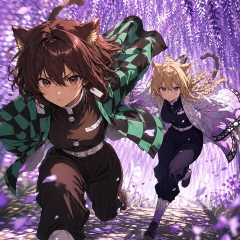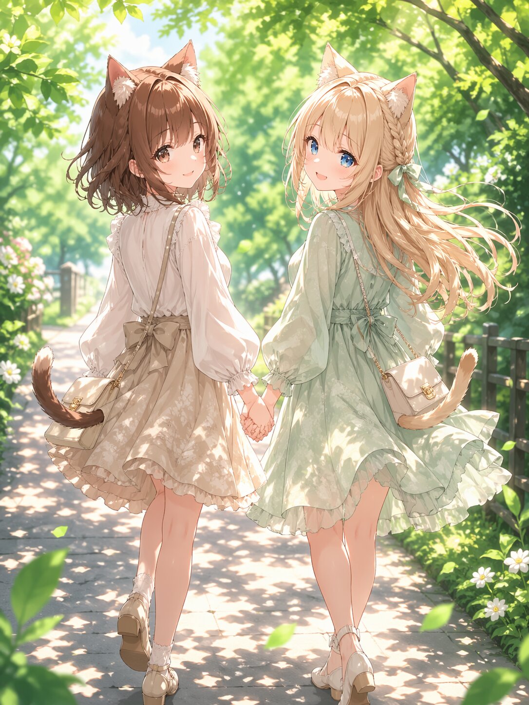 2girls, similar height, same age appearance, close relationship, holding hands firmly, interlocked fingers, natural interaction, anime style, highly detailed, beautiful detailed eyes, soft natural expressions, gentle smile, looking back at viewer, one girl with brown eyes, chestnut brown hair, wavy bob hair, loose inward curls, hair between eyes, natural small cat ears, natural cat tail, medium breasts, one girl with blue eyes, long blonde hair, braid, hair between eyes, natural small cat ears, natural cat tail, medium breasts, light spring outfits, soft fabric, flowing dresses, one wearing off-white blouse with light beige skirt, one wearing soft mint green dress, subtle matching color palette, light green tones, natural coordination, walking together, slightly leaning toward each other, synchronized steps, relaxed posture, fresh green May scenery, lush greenery, vibrant leaves, sunlit tree-lined path, soft grass, dappled sunlight, floating leaves, light breeze, warm and refreshing atmosphere, SNS-friendly composition, dynamic and eye-catching, three-quarter rear view, slightly low angle, diagonal composition, natural perspective depth, camera from slightly behind and side, both faces visible, looking back at viewer, soft rim light, backlighting, gentle glow, natural light scattering, depth of field, background blur, flowing hair and clothing, subtle motion, tails gently swaying, ears expressive, high detail, masterpiece, best quality, ultra detailed, vivid colors