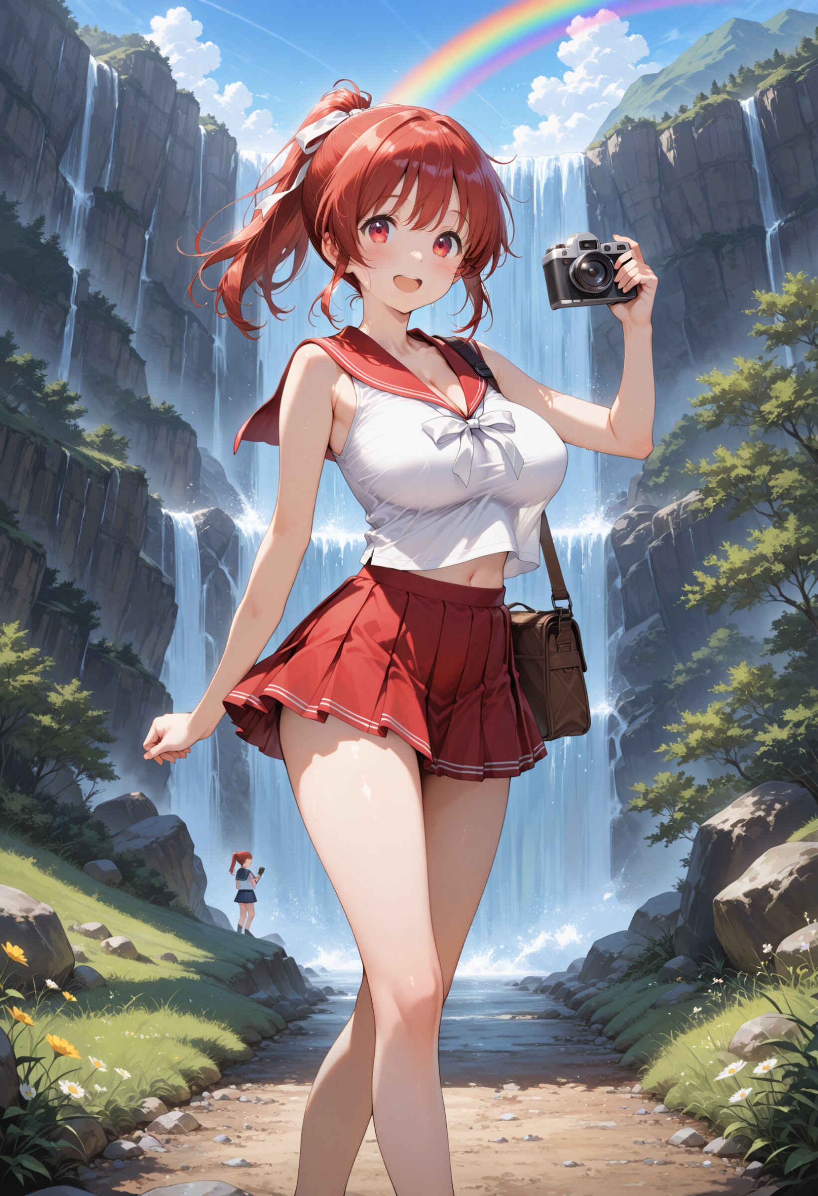 masterpiece, best quality, highres, ultra-detailed, extremely detailed, detailed, 1girl, loli, petite, school sailor uniform, red sailor collar, sleeveless, miniskirt, beautiful legs, ponytail, red hair, midriff peek, cleavage between sailor collar, spring, big breasts, impossible clothes, perky breasts, cleavage between sailor collar, Tie hair with a white ribbon, Hiking trail, shoulder bag, camera in one hand, large waterfall, rainbow, happy,