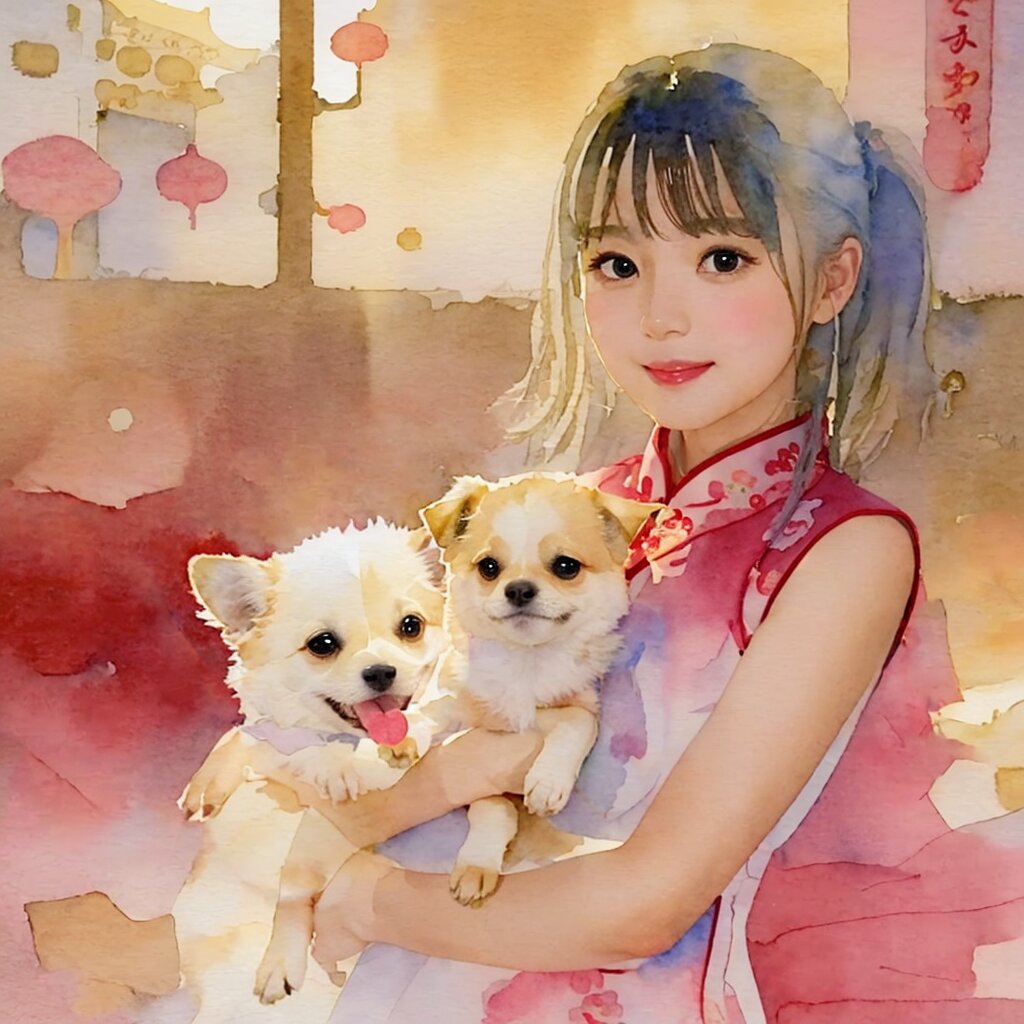best quality, masterpiece, (watercolor painting:1.38), (line art:1.2), (illustration:1.1), (cel anime:1.0) Portrait, (face focus:1.6), (close up:1.4), soft lighting, soft shadow, (light on face:1.2), Backlighting, Golden Hour, slightly moving in the breeze,(Chinatown), (from side:1.6), japanese, 1 cute girl, (large eyes:1.0), (brown eyes), bob, (smile:0.4), (looking at viewer:1.3), Residential area, hands up, (sleeveless cheongsam dress:1.3) , hands on dog, fluffy white Chihuahua,