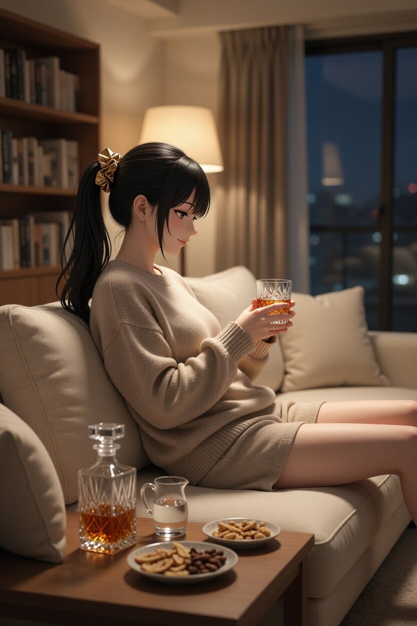 日本人女性24歳が、自宅のリビングでウィスキーを楽しんでいる。つまみと水割りセット。リラックスできる室内着をきている。シュシュは金色。側面からの構図。