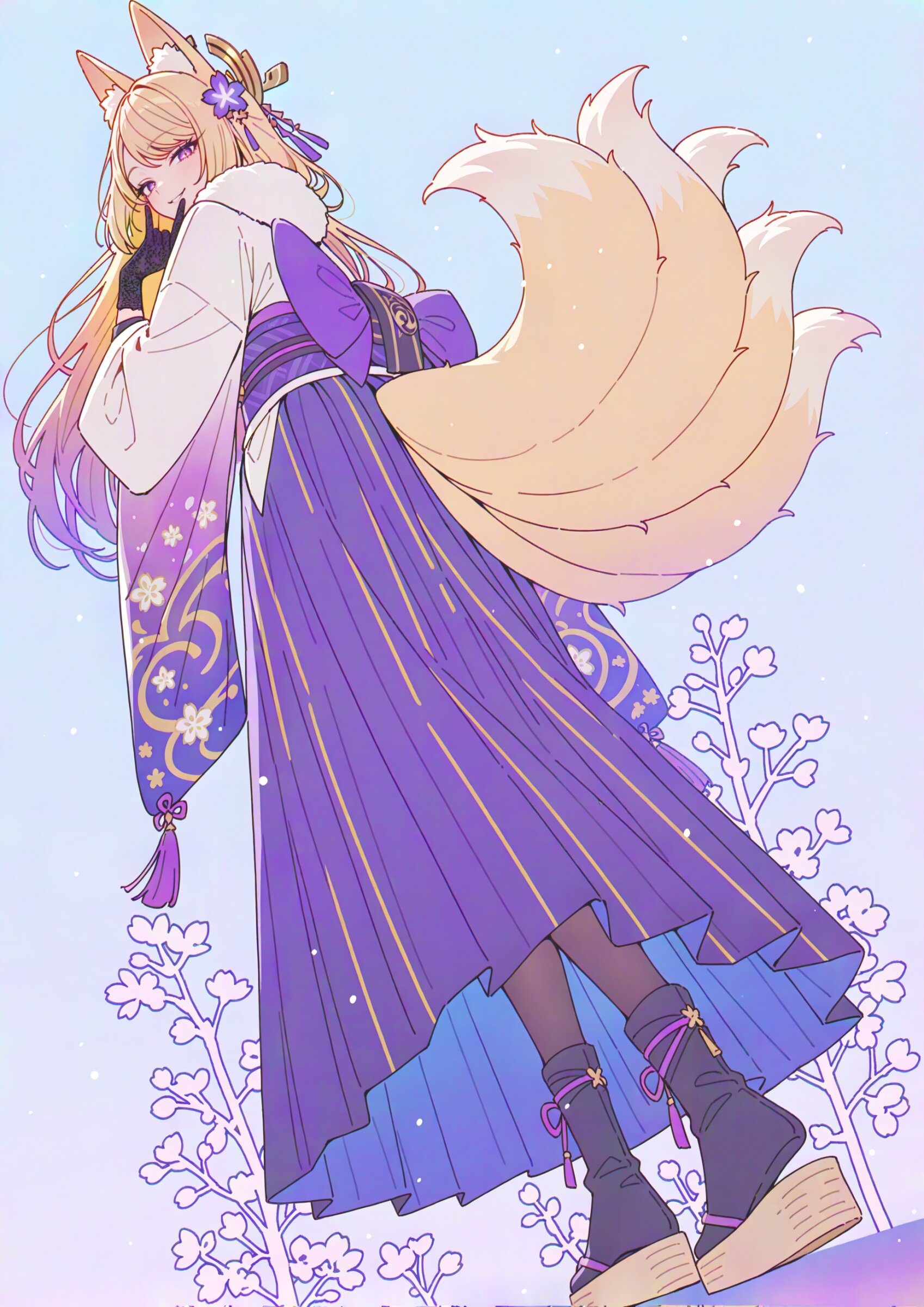 Over the Shoulder Shot, looking back, from below, looking down, (face:1.2), cinematic angle, (on the screen of smartphone camera app frame:1.0), looking at viewer, (simple light colorful pale blue background:1.1), drop shadow, colored shadow, The background is a solid, bright colorful pale blue, creating a striking contrast with the intricate, multi-colored design of the character, (ink wash effect:0.9), pop color background, (high saturation:1.2), spring coloring, spring atmosphere, 1girl, fox girl, gold Blond Hair, large breasts and fox ears, (swept bangs:1.2), (perfect purple eyes:1.3) long eyelashes aristocratic features tall girl has (Blond Hair long hair over ears:1.3) fox 9tails, (wearing White Japanese Cloth straw sandal black silk gloves long skirt Obi boots:1.3), hair ornament flower, tabi, winter scarf, (fur trim:1.1), black thighhighs, wide sleeves, mysterious atmosphere, seductive smile, closed eyes, comfy, cherry blossoms, double \m/, colorful pale blue theme, super fine concept art, hard surface, graceful eyes, masterpiece, best quality, amazing quality, very aesthetic, absurdres, newest, professional art lots of details, , overexposure, sumie effect style, 4ur4_illu,shiny, glowing, glowing particles, glowing light particles, light particles, vines chocolate, <lora:noline (1):-0.5> <lora:sdxl2-flat2-512b:0.2> <lora:facelightup_xl_v10:0.5> <lora:V2_yakumo_alchemy:0.5> <lora:Aura_illu:0.1>