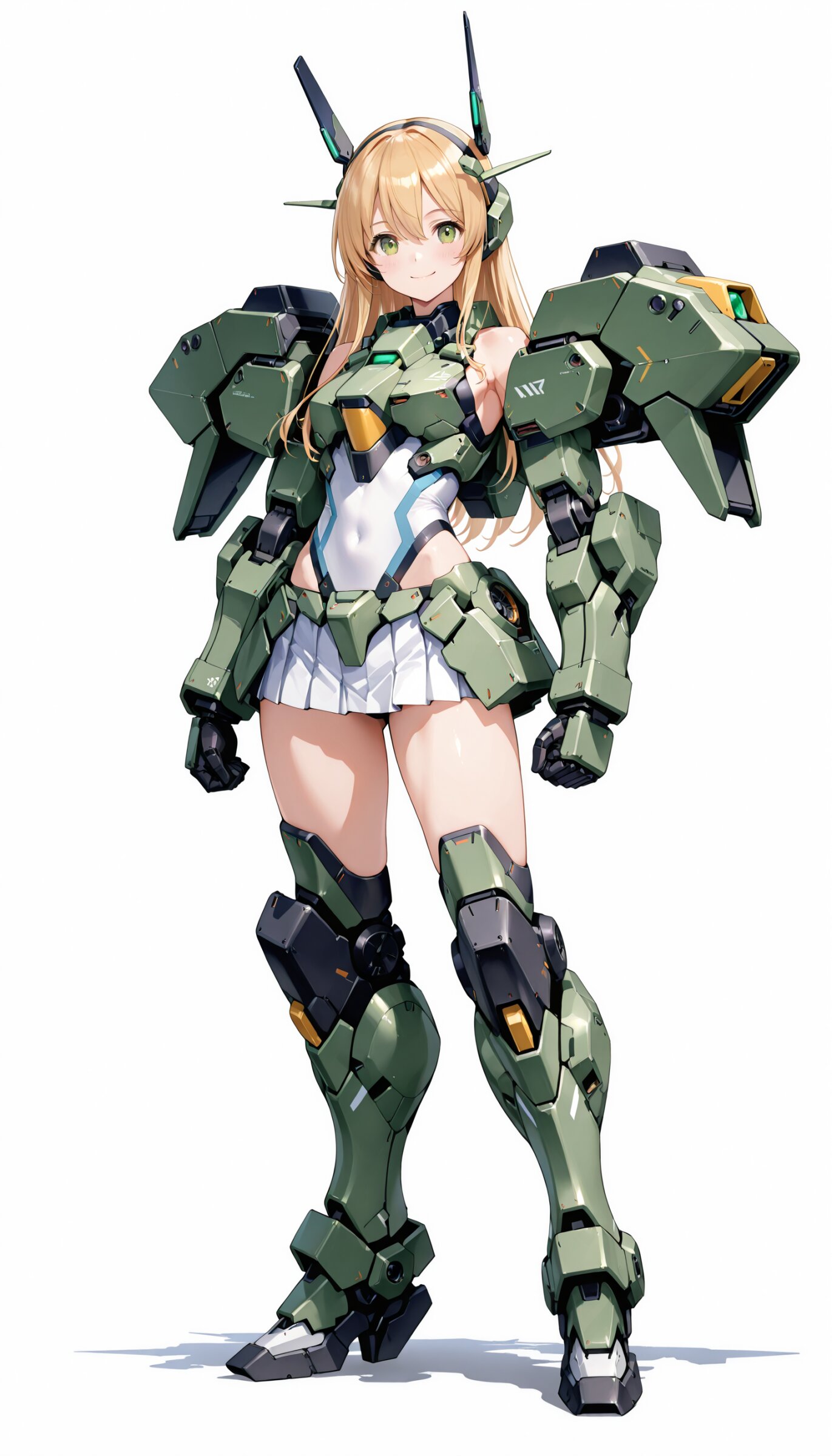 1girl, ((white background)), ultra detailed 8k cg render, masterpiece, high resolution, extremely detailed, mecha musume,mecha shoulder, mech leg, headgear, mecha armor, ((mini skirt)),long blonde hair, dropping green eyes, smile, dynamic posing,