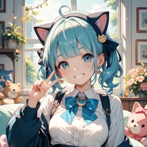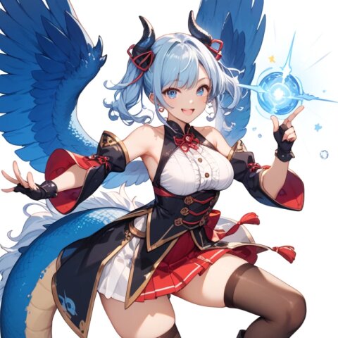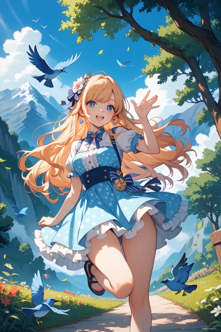 新緑が美しい早朝の山道、山間の山道を若い女性が散歩をしている。 髪の長い女性。 水玉模様のミニドレス姿長い髪の毛が微風たなびいている可愛く手を振っているポーズ。 笑顔の女性。 初夏の緑がが美しい背景。 青い小鳥が飛んでいる