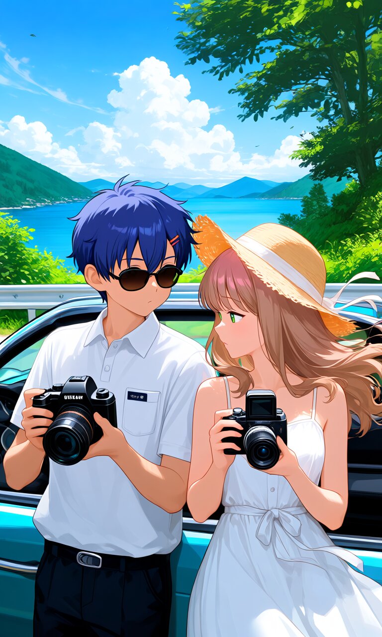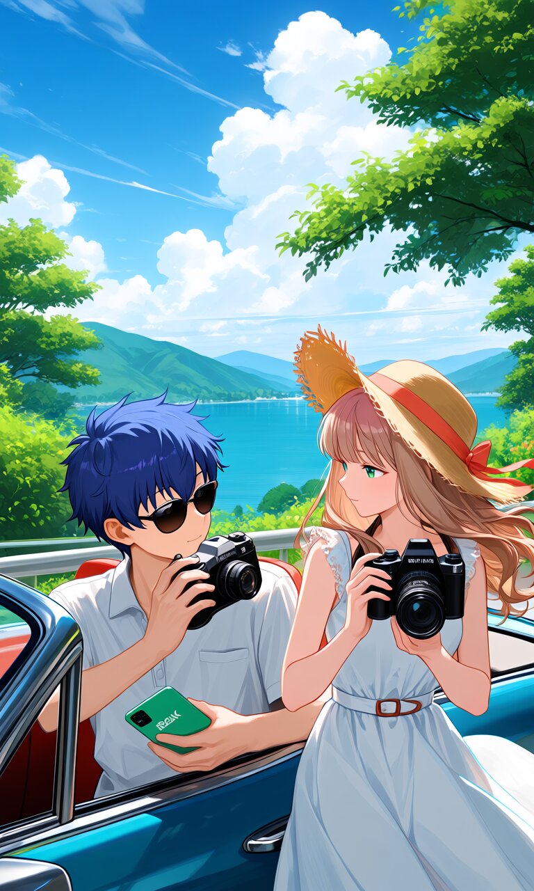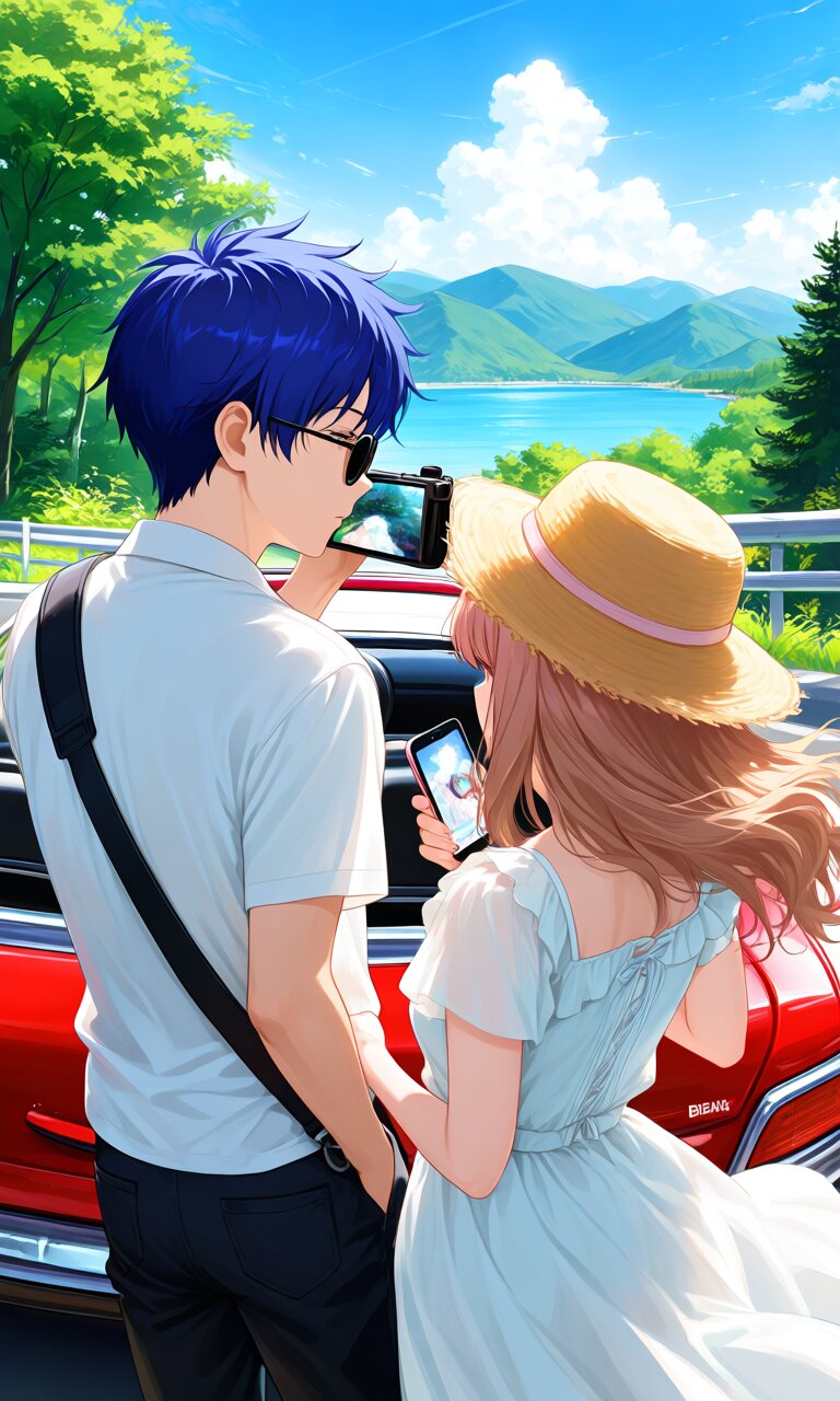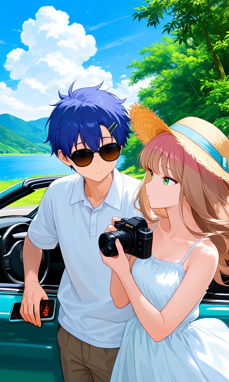 Couple, boy and girl, two people only,absurdres, ultra-detailed, master piece, high resolution, 8k, Boy, girl, couple, A young couple, on a drive during Golden Week, stands beside a convertible or sports car on a mountain road or lakeside surrounded by lush greenery. The man is wearing a white polo shirt and sunglasses, while the woman is wearing a straw hat and light spring/summer fashion. They gaze at the lake and mountain range together, their hair swaying in the gentle breeze. The atmosphere is relaxed and holiday-like, with a blue sky, white clouds, and lush green trees. They are posing for photos with their cameras and smartphones. BREAK the boy(asanaka yomogi) BREAK the girl(minami yume ),harukav2 style