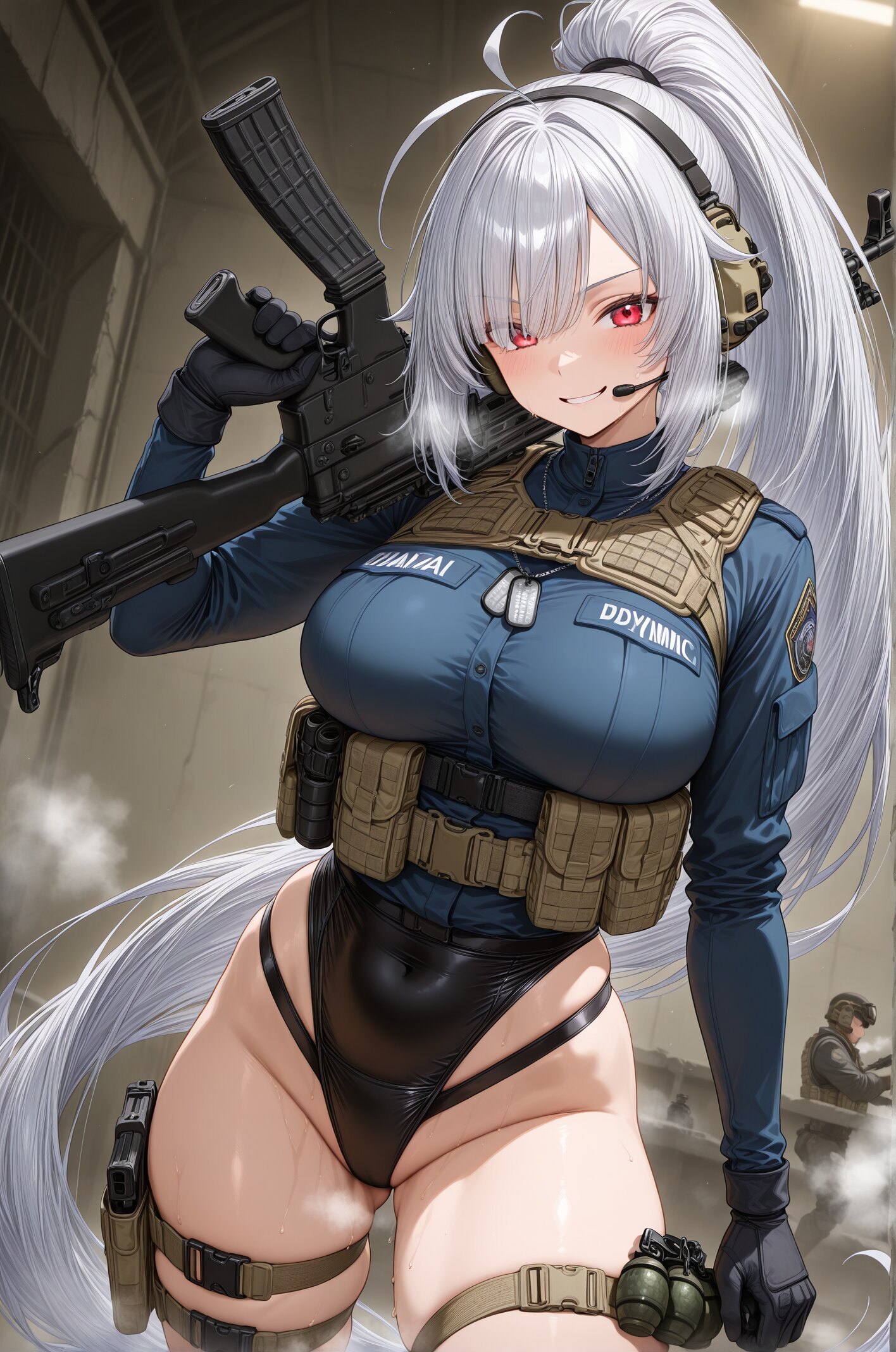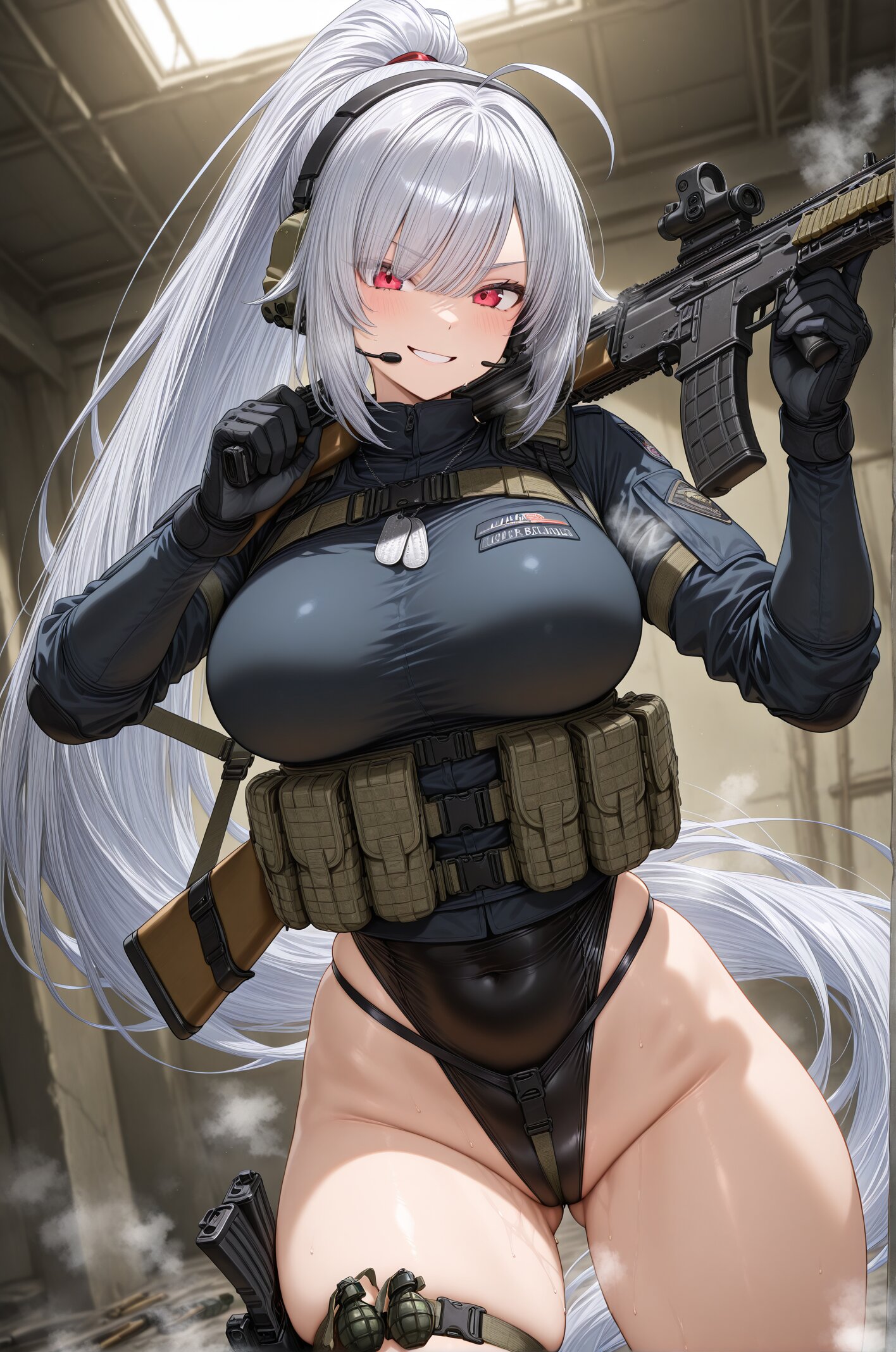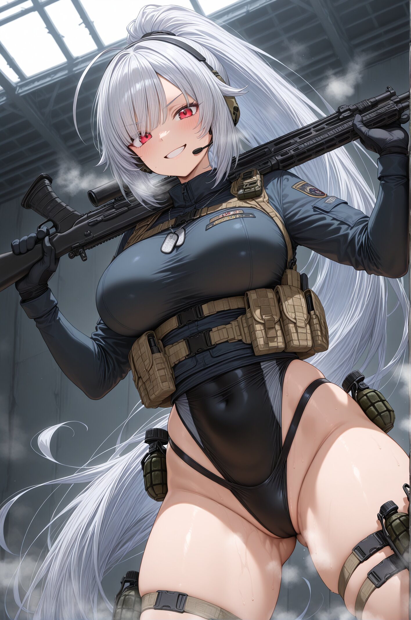 (absurdly long silver hair), ahoge,(high ponytail), (red eyes),(steam:2.5), (upper body:1.8), tactical military style, standing pose, confident expression, combat vest, military gloves, headset or tactical goggles, dog tags, ultra high-leg leotard, ammo belt, holding assault rifle, finger off trigger, weapon slung over shoulder, (heavy ammo pouches tightly strapped to upper thighs:1.5), (multiple rifle magazines attached directly to thighs:1.4), (grenade holders wrapped around each thigh just below high-leg line:1.4), (tactical straps pressing against skin:1.3), smile, 1girl, long hair, (large breasts and hips:1.3), masterpiece, best quality, ultra-detailed, 8k resolution, very aesthetic, amazing quality, background of military base, hangar, or battlefield ruins (dynamic pose:2.2),dynamic angle,masterpiece,best quality,very aesthetic, <lora:StS-Illustrious-Detail-Slider-v1.0:2.> <lora:sdxl-hairdetailer_02:2>