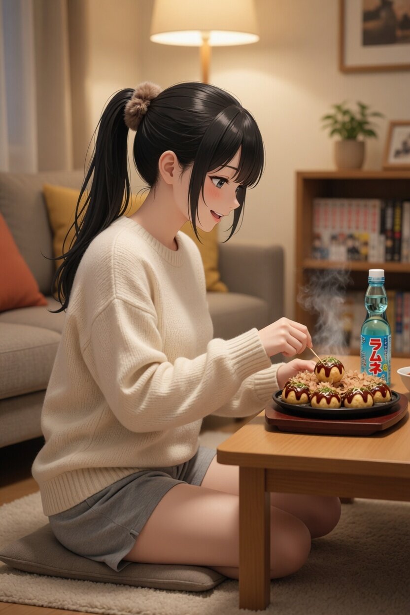 日本人女性24歳が、自宅のリビングでたこ焼きを楽しんでいる。クラシックな瓶入りラムネもテーブルにのつている。リラックスできる室内着をきている。シュシュは茶色。側面からの構図。